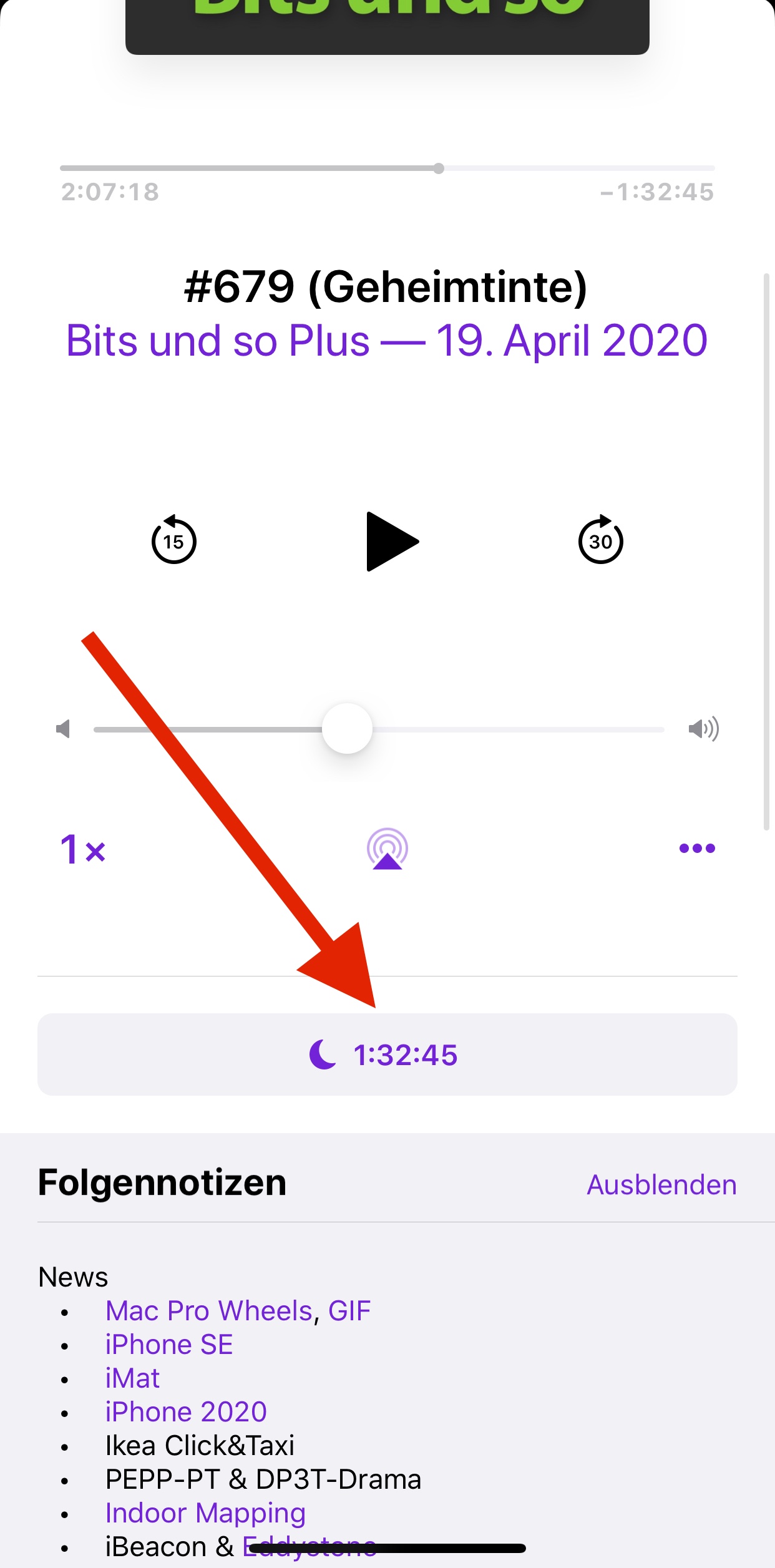 Du hast nicht vielleicht einfach versehentlich den Sleeptimer angeschaltet? Den findest Du, wenn Du den laufenden Podcast nach oben ziehst, dort wo man auch die „Folgennotizen“ (Shownotes) findet: