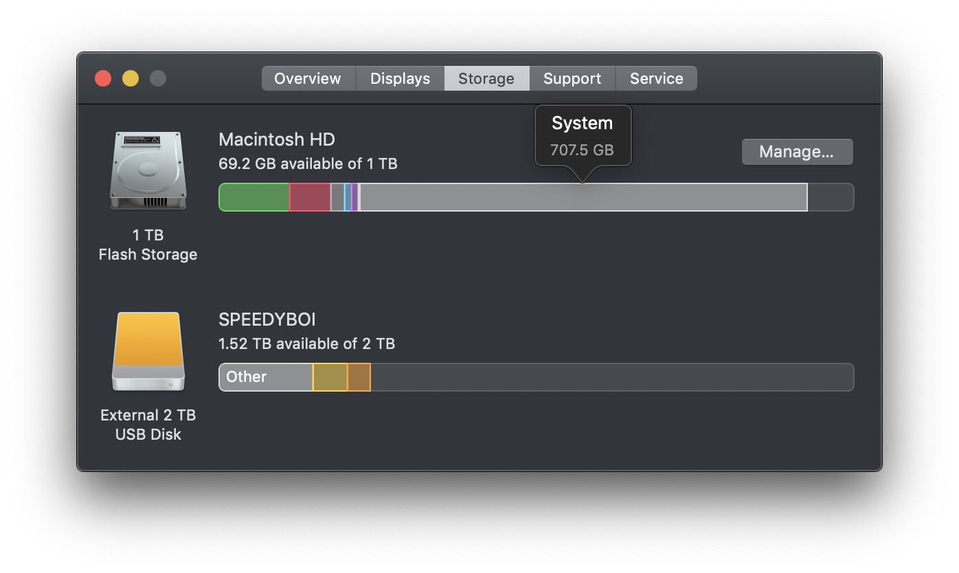 Mein MacBook Pro hat eine 1TB SSD, wobei jedoch fast 240GB vom System-Speicher belegt sind.