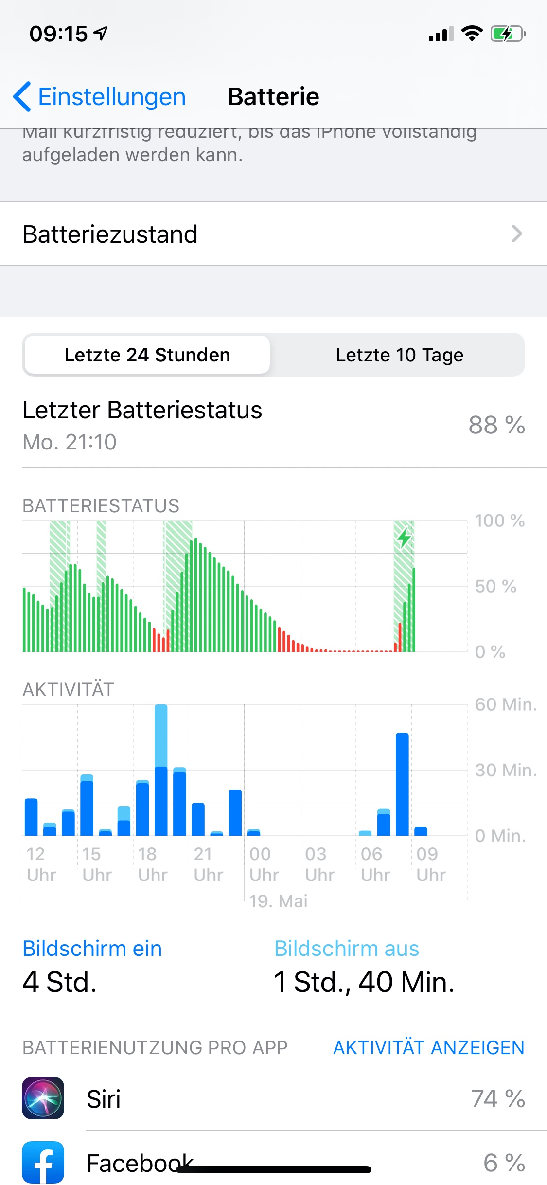 In den letzen Wochen ist mir aufgefallen das mein iPhone Xs sehr viel Energie verbraucht. Es ist ein Jahr alt und der Batteriezustand liegt bei 85%. In der Analyse hatte ich festgestellt das Siri im Deaktivierten Zustand 75% (stand 19.05.2020) verbraucht. Siri war vorher nicht Deaktiviert und habe auf Empfehlung diesen Vorgang ausgeführt. Leider ohne Erfolg!