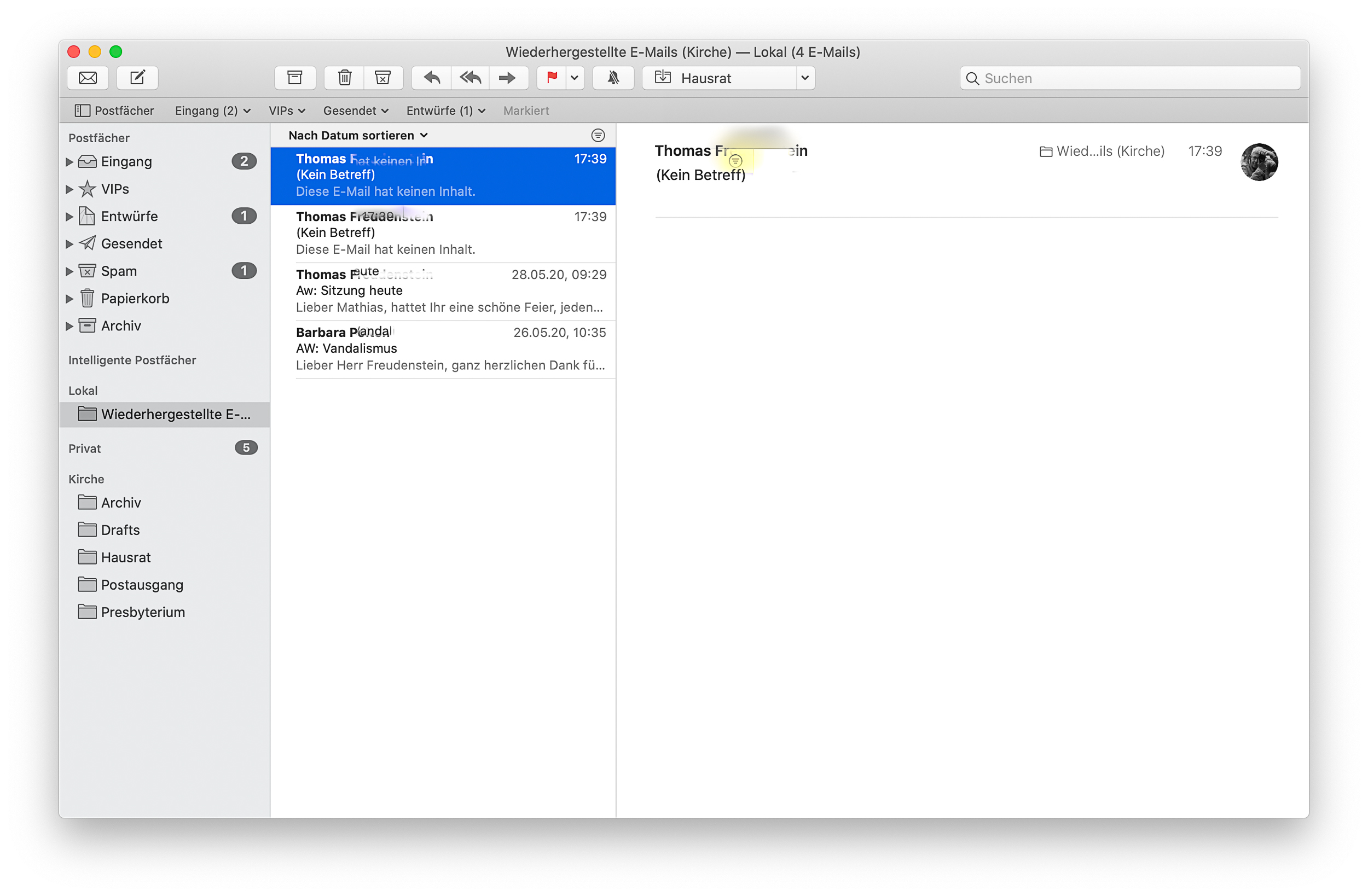 Ich habe ein Problem mit der Mail App auf dem iMac und dem MacBook Pro. Beide laufen mit Catalina 10.15.4. Ich habe drei verschiedene E-Mails Accounts. iCloud, Outlook und nun auch einen Account der Kirche für meine ehrenamtliche Tätigkeit. Das Problem tritt nur bei dem Account der Kirche auf. Es handelt sich um einen IMAP/SMTP Account. Wenn ich eine Mail aus dem Posteingang in einen untergeordneten Ordner verschiebe (oder zurück), dann legt Mail sofort einen lokalen Ordner für wiederhergestellte Mail an und legt eine Kopie der Nachricht in diesem Ordner ab. Mit der Zeit werden es dann ziemlich viele doppelte Mails. Das Problem tritt nicht auf, wenn ich eine andere App für die Mail verwende (Outlook oder Spark). Ich arbeite aber grundsätzlich lieber mit der nativen App. Interessant ist die Tatsache, dass ich mit dem iPhone oder iPad die Mail verschieben kann, ohne dass auf den Macs eine Kopie in diesem Ordner abgelegt wird. Any ideas?
