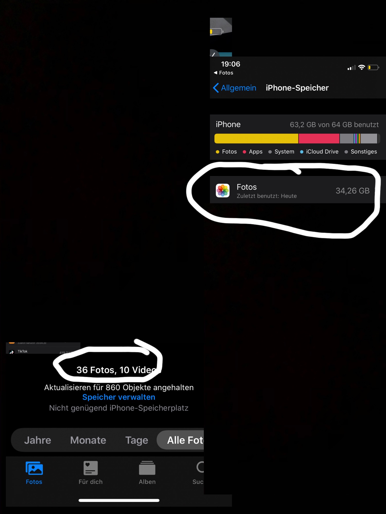 Nun hab ich nurnoch 35 Fotos und 10 Videos übrig , aber beim Speicherplatz wird noch immer angezeigt dass die App „Fotos“ 34GB Verbraucht.