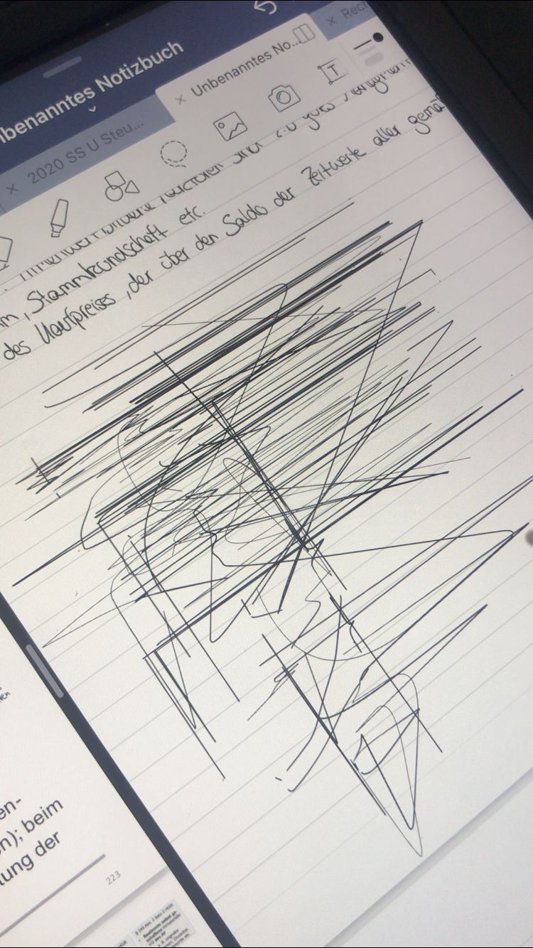Dann habe ich gemerkt, dass die Striche nur auftauchen, wenn auch meine Handfläche sich beim Schreiben auf dem Bildschirm befindet. Als ich versucht habe zu schreiben ohne die Handfläche aufliegen zu haben ging es einwandfrei (Wer kann mit dieser Technik schön schreiben...?) Als ich direkt im Anschluss beim Schreiben die Handfläche wieder aufliegen hatte, tauchten wieder diese Striche auf.
