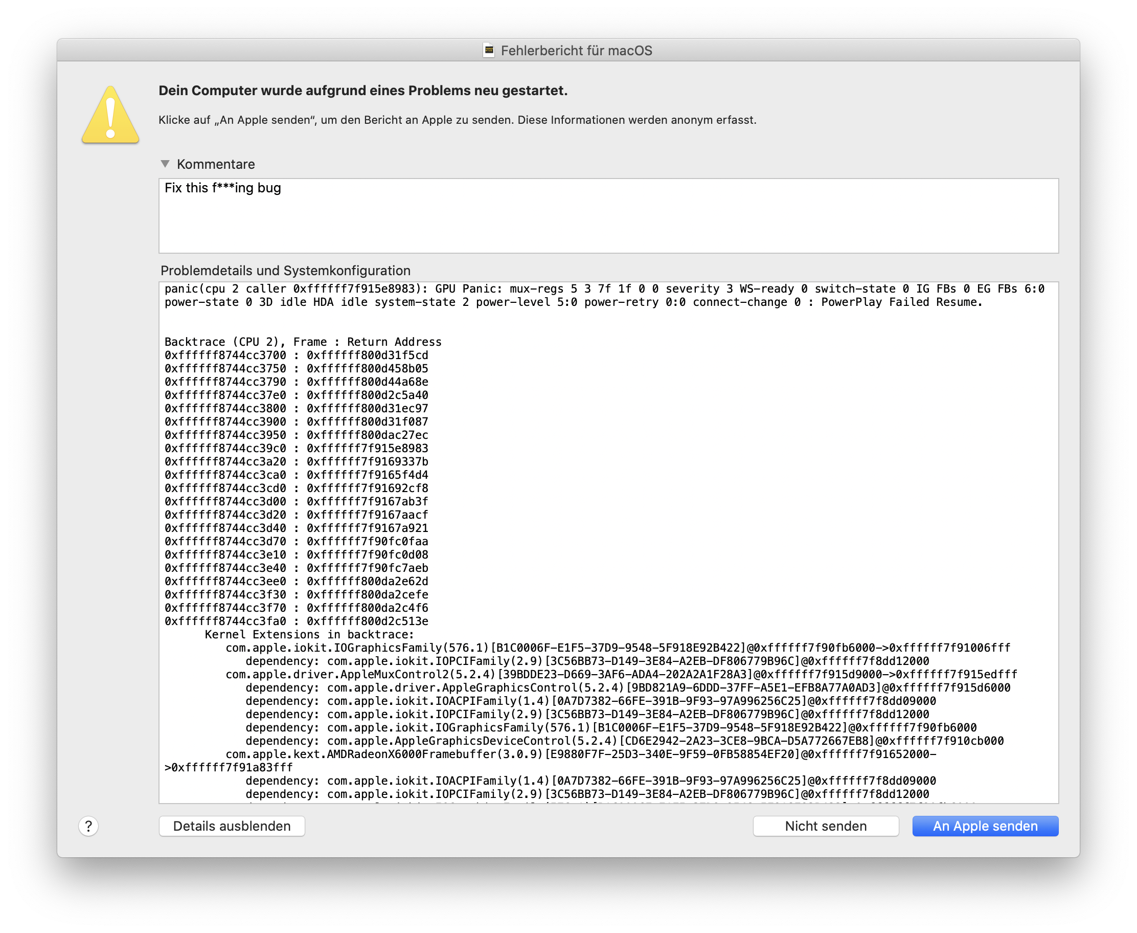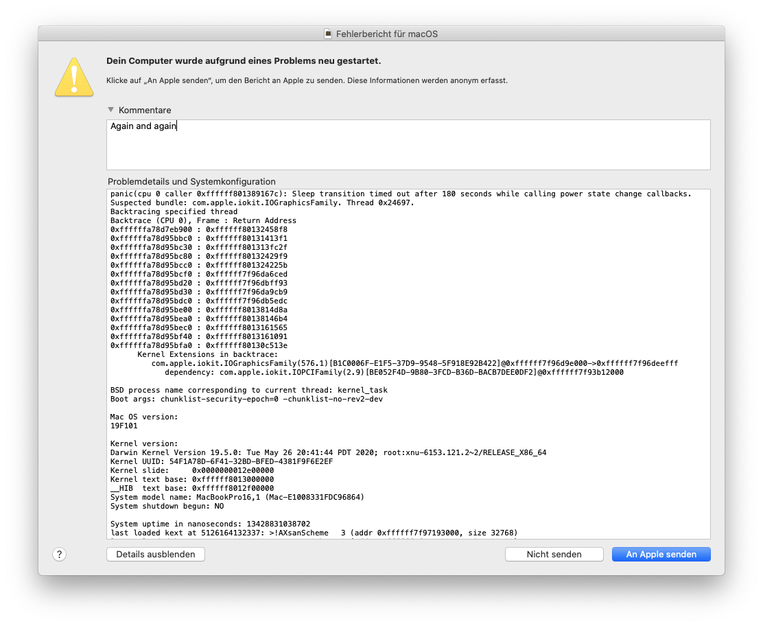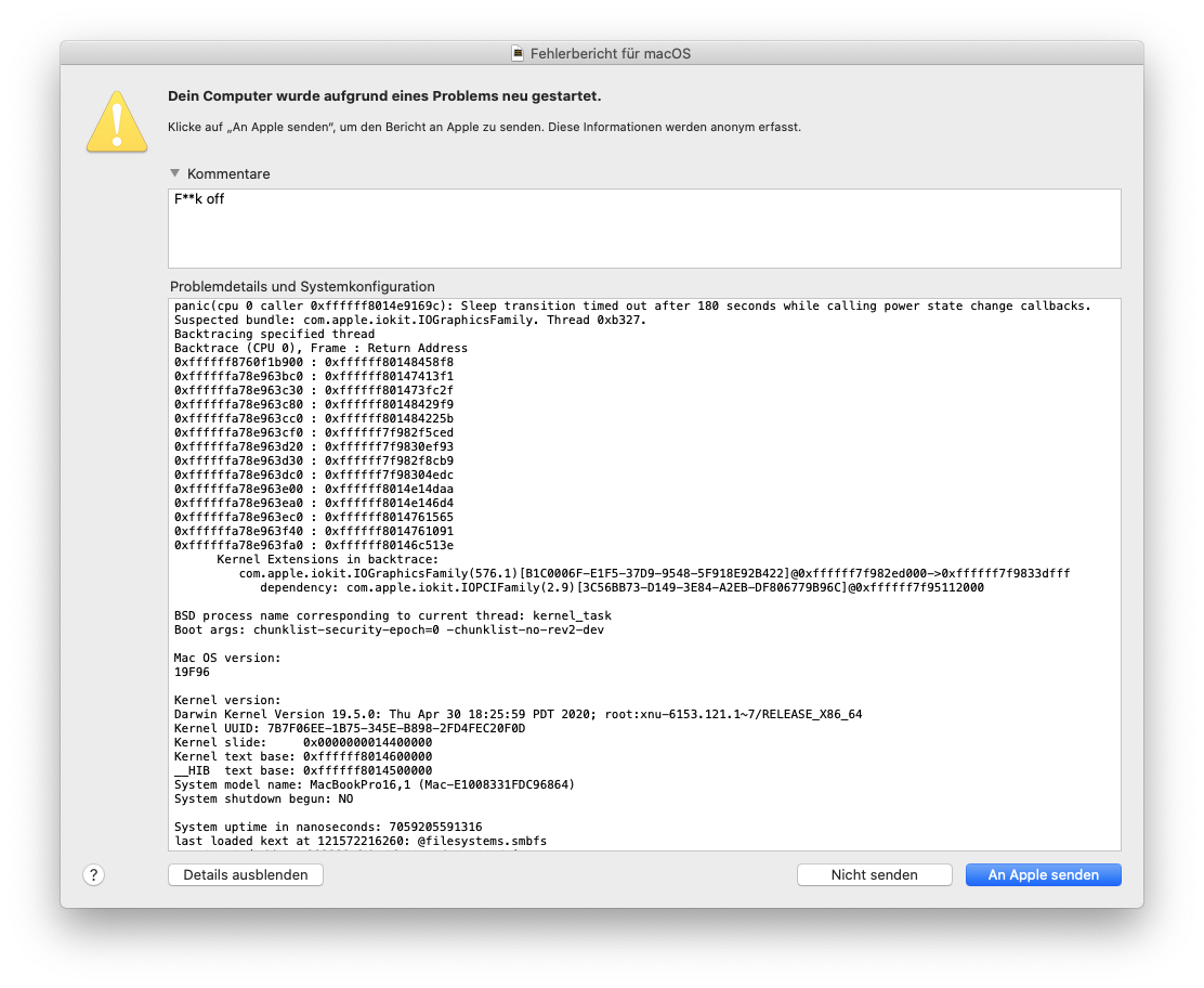 On my workspace in office the macbook is connected to displays and power charger. After I'm done at a day, I just disconnect all the adapters (pay the machine, pay for adapters), put my macbook (without shutting down, I've never done this before with other macbooks or linux machines) into my bag and go home. At home I wanna to continue building/working on my stuff, BUT.... I open the cover or connect to my displays (at home) and this damned system is crashed. So it restarts or has to be restarted. Again and again, it's crashing after just being with closed cover for a while. With having a macbook for about 4500$ I have to live with this damned crashes, because Apple is just unable to get this bug (or whatever shit it is) fixed. All my apps, all my running compiler or builder should be restarted, rerun or whatever I have to do to get the last status before crash.