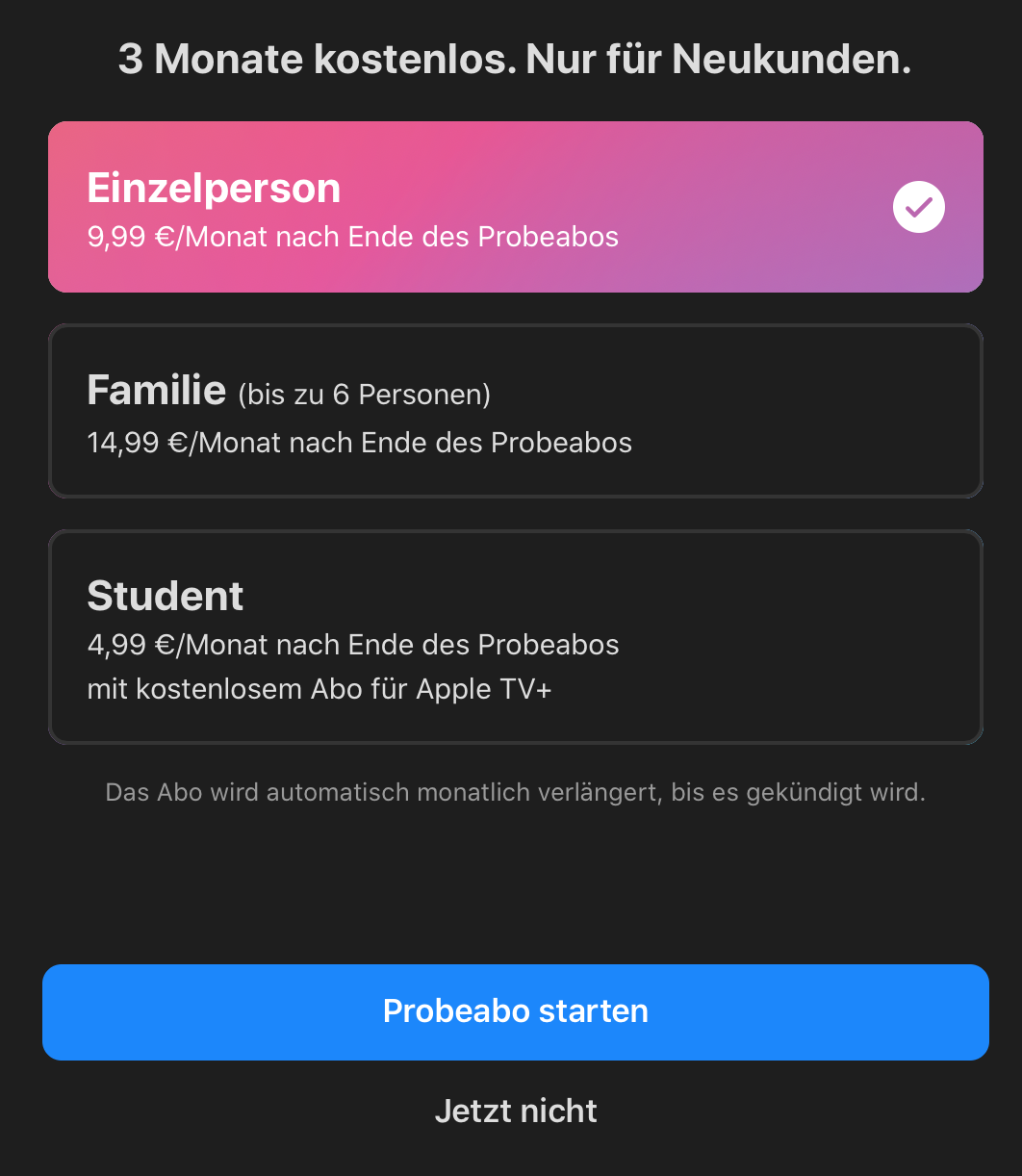 Ich habe ein Probe Familienabo bei Apple Music bereits vor ca 2 Monaten abgeschlossen. Trotz Familienfreigabe haben die anderen Familienmitglieder keinen Zugriff auf Apple Music.