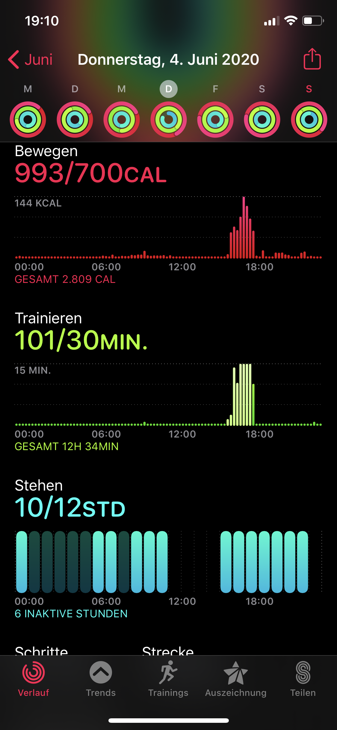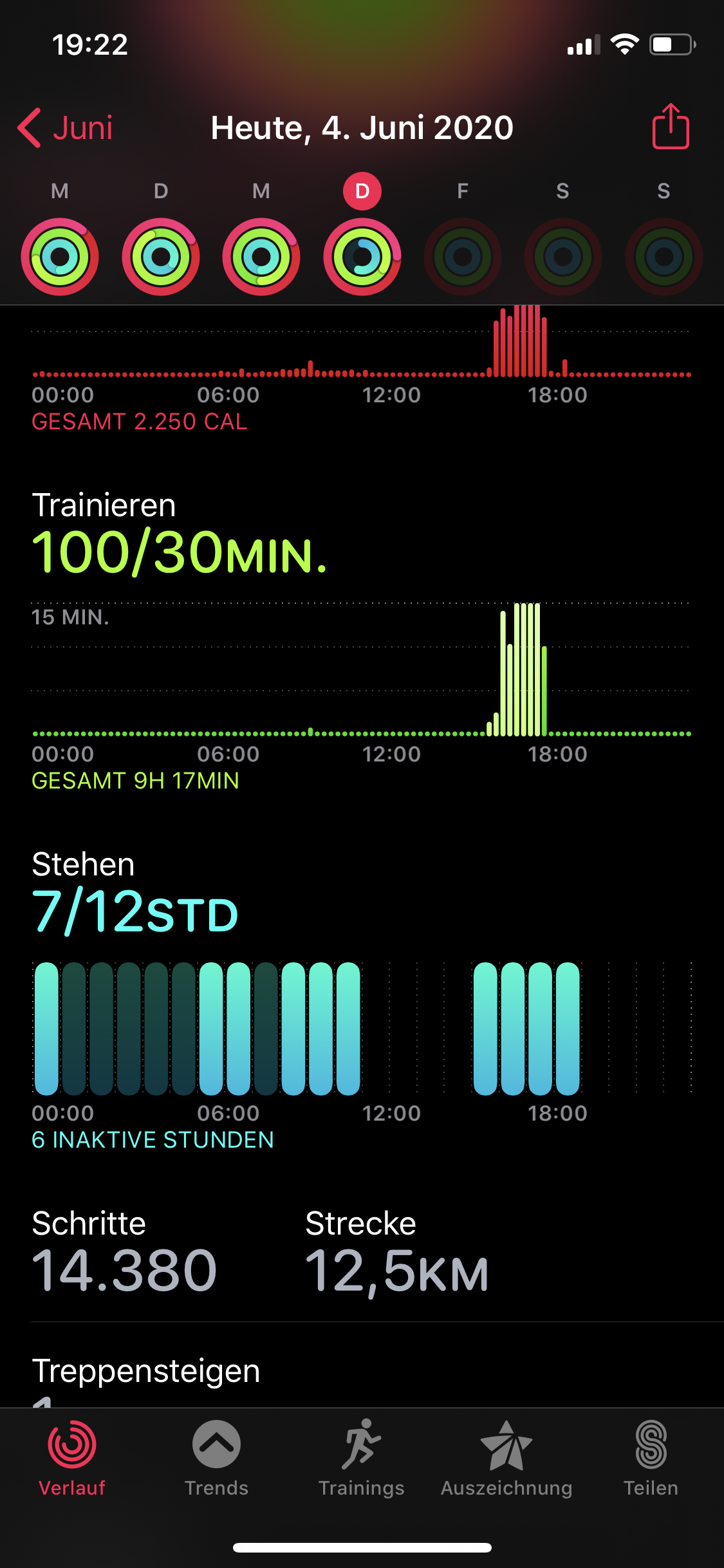Wenn ich mir jetzt die Aktivitäten App im iphone ansehe, hat sie leider Beim Stehen an dem Tag falsch gezählt. Es sind 13 blaue Balken und zehn wurden nur gezählt. In der watch kann man ja keine vergangenen Tage ansehen.