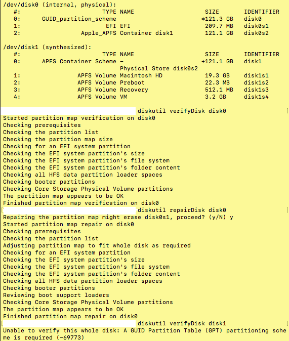 Mein Rechner stürzt dauernd ab, sobald er Softwareupdates o.ä. installieren soll, selbst wenn ich es vom Terminal aus anstosse. Wenn ich dort eine Reparatur versuche, bekomme folgendes Bild: In der letzten Zeile wird für die disk1 eine GPT verlangt, die aber in der disk0 ist. Kommt ein Befehl wie partitionDisk oder mergePartitions in Betracht? Dafür reicht aber mein Verständnis und mein Englisch nicht. Bitte keinen Hinweis auf den telefonischen Support, denn der ist für ein Gerät aus 2011 kostenpflichtig. Ich würde mich sehr freuen und den Befehl natürlich auf eigene Verantwortung ausprobieren, ein Backup ist auch vorhanden!