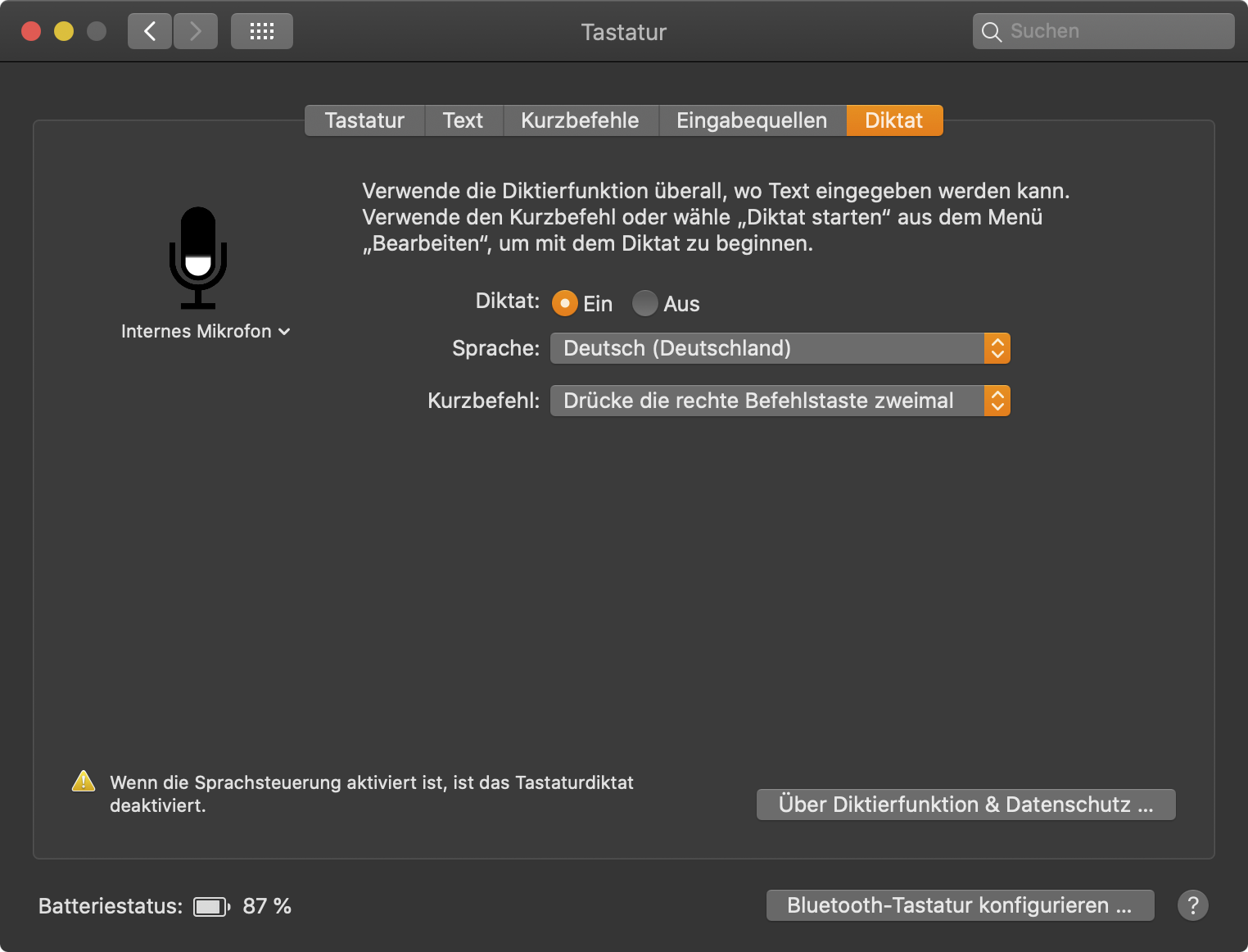Mein Mikrofon funktioniert, aber ich kann "Diktat" nicht verwenden, weder bei Pages , noch bei Mail.
