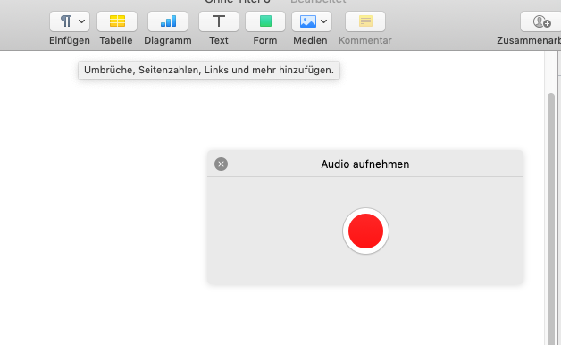 In Pages machst Du doch eine Aufnahme über Taste: Medien-> Audio aufnehmen und dann kannst Du nach Klicken der roten Taste im Fenster "Audio aufnehmen" fleißig losträllern.