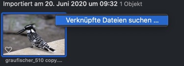 Normalerweise repariert Fotos die links für alle verknüpften Dateien im selben Ordner automatisch, wenn man im in Dialog "verknüpfte Datei suchen" den Ordner mit der Datei auswählt und nicht die gesuchte Datei im Ordner. Das funktioniert in der aktuellen Version von Fotos 5 nicht mehr richtig. Fotos 5 reagiert meistens nicht einmal mehr, wenn man auf den gebrochenen roten Link auf der Miniatur klickt. Das Kommando wird noch angezeigt, aber dann geht es nicht mehr weiter.