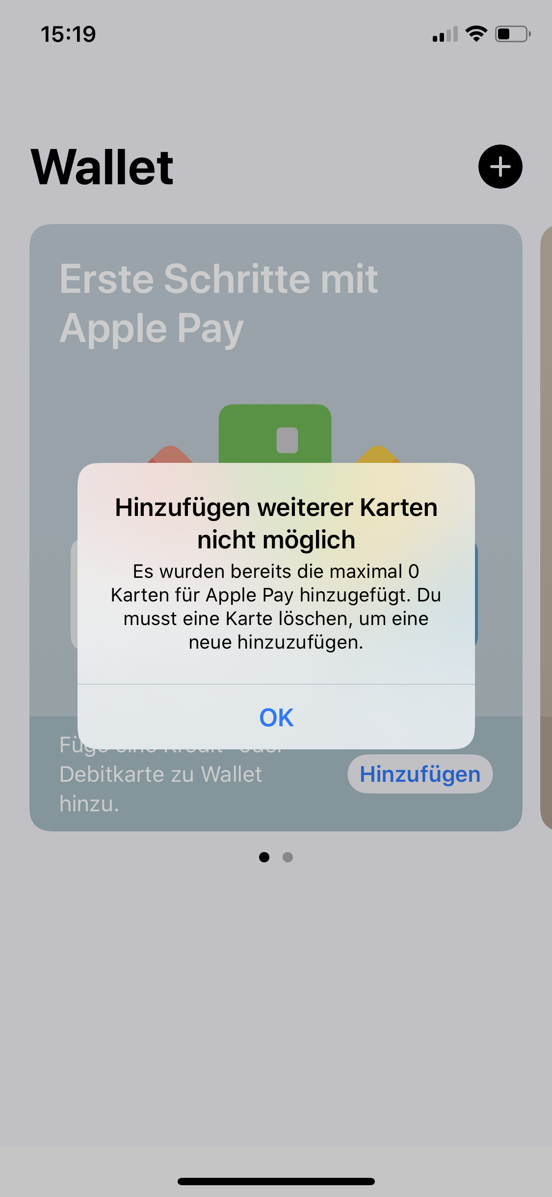 Ich kann keine Karte auf Apple Wallet hinzufügen. Wenn ich auch das „+“ drücke. Kommt die Anzeige „ Es wurden bereits die maximale 0 Karten auf Apple Pay hinzugefügt. Du muss eine Karte löschen, um eine neue hinzuzufügen.