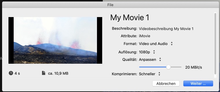Falls du noch nicht gefunden haben solltest, wie du in iMovie die Kompression und Qualität des exportierten Videos festlegst: