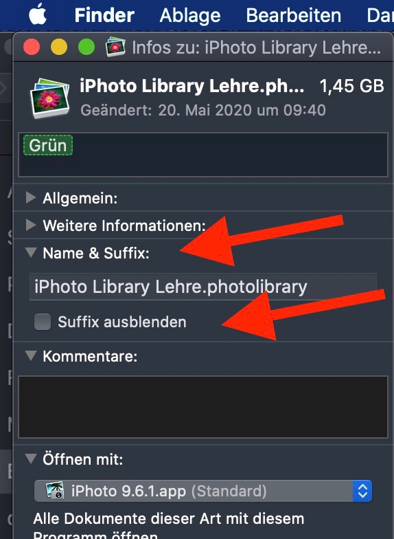 • Dann gehe in der Info auf das Feld "Name und Suffix" und ändere den Suffix von ".migratedphotolibrary" zurück auf ".photolibrary", so dass die Mediathek wieder "iPhoto Library.photolibrary" heisst.
