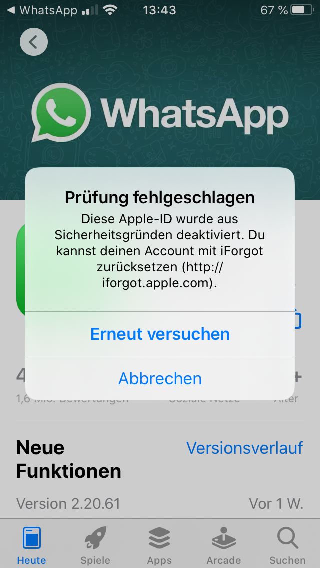 ich werde aufgefordert für die Aktualisierung von WhatsApp mein Passwort für die Apple ID anzugeben. Allerdings ist mein WhatsApp unter einer anderen Apple ID angelegt worden. Trotz Änderung des Passwortes für meine persönliche Apple ID kann ich WhatsApp nicht aktualisieren. Die Version ist nun abgelaufen und ich kann nicht auf WhatsApp zugreifen. Meine Chats auf der bestehenden App möchte ich nicht verlieren. Also kommt Löschen der bestehenden App und neu Runterladen von WhatsApp im Apple Store wohl nicht infrage. Was kann ich tun?