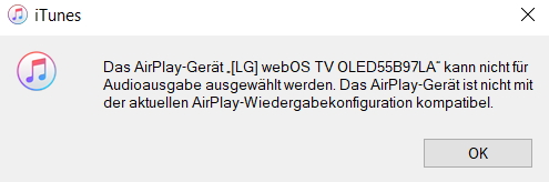 ich habe einem halben Jahr einen LG OLED55B97LA mit integriertem Airplay2. Airplay kann ich vom iPhone oder iPad problemlos am TV nutzen. Aber sobald ich mit iTunes für Windows an einem meiner PCs (aktuellste iTunes/Windows10 Version) eine Airplay-Verbindung zum TV aufbauen will erscheint eine Fehlermeldung: