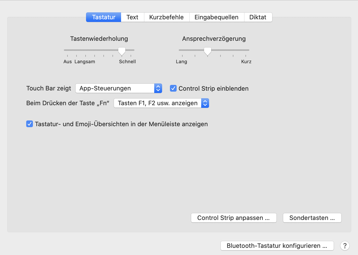 Allerdings ist bei mir die Option „Tastaturhelligkeit bei schwacher Beleuchtung anpassen“ nicht vorhanden. Ich habe ein MacBook Pro 13" aus dem Jahr 2019 Model A1989. MacOS Monterey 12.1 installiert. Ich hatte einmal versucht, das MBP zu schließen, als der Thunderbold-Stecker noch auf der Tastatur lag. Da war das Display hin. Mit rund € 520 Euro neuen Orginal-Displaydeckel eingebaut. TrueTone funktionierte zwar nicht bzw. kann nicht ein- oder ausgeschaltet werden, weil der Button einfach fehlt, aber das ist mir nicht so wichtig gewesen. Jetzt ist es die Tastaturbeleuchtung.
