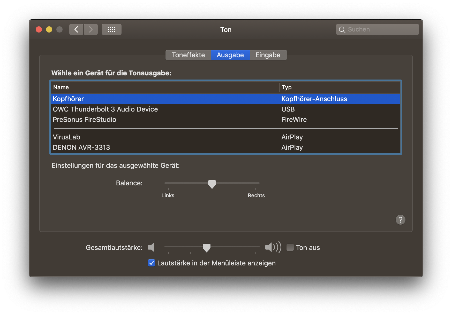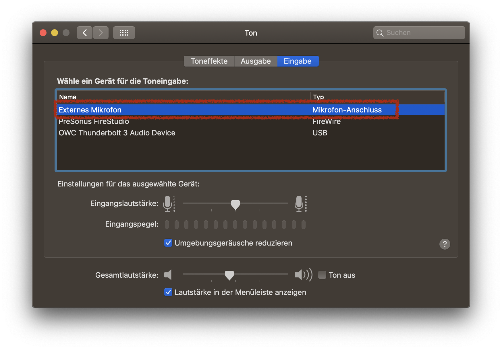 Von dort kommst du übrigens ebenfalls in die "Ton"-Systemeinstellungen, wo du allenfalls auch noch die Eingabegeräte - inklusive den Eingangspegel, falls nötig - wählen kannst.