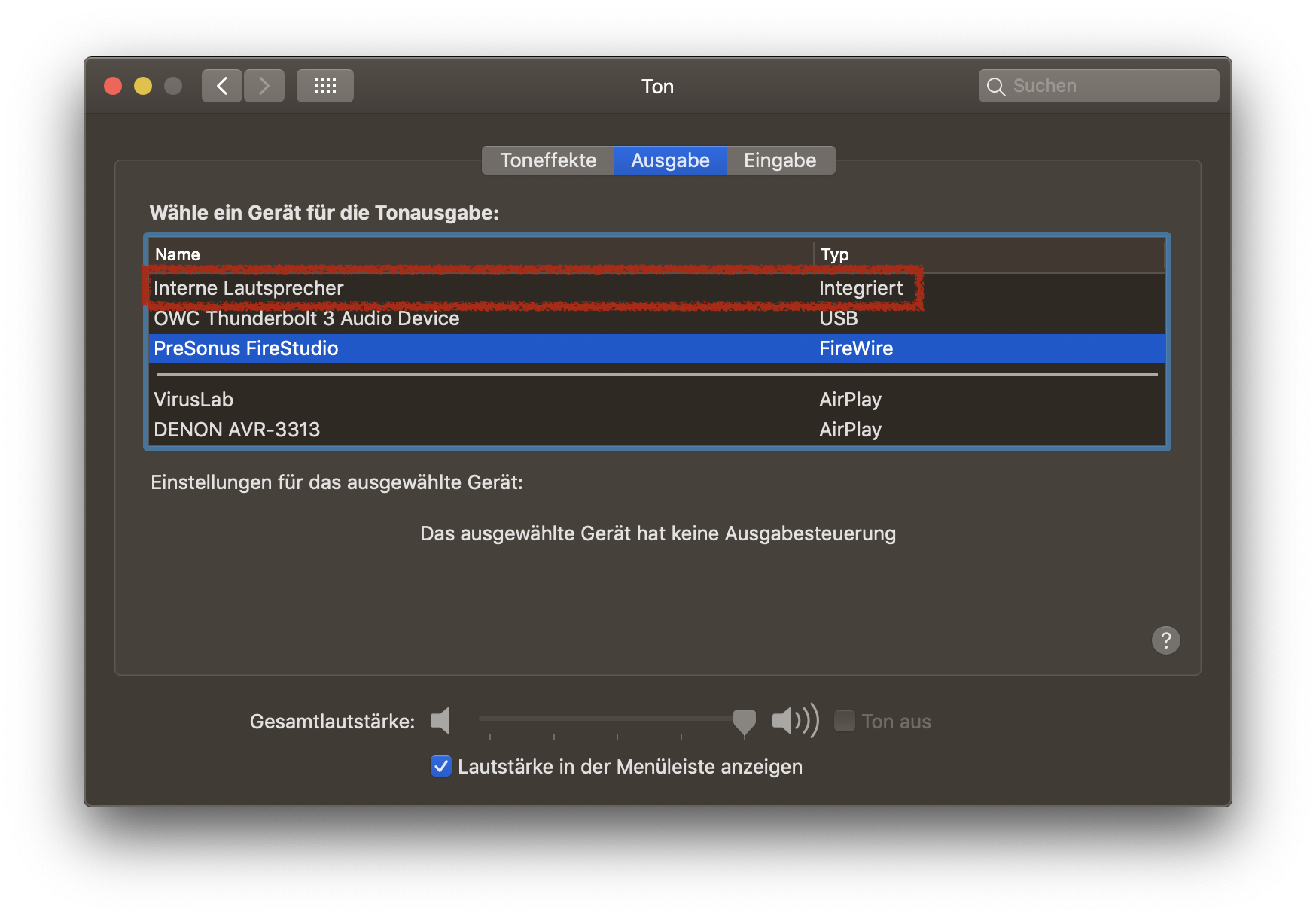 Sorry, da hatte ich wohl Tomaten auf den Augen! Meine originale Antwort weiter unten lasse ich dennoch mal so stehen, weil meiner Meinung nach sollte das so funktionieren. Aber vielleicht kannst du da noch einmal genauer erläutern, was du mit "finde ich keine Möglichkeit" meinst? Fehlen die "internen Lautsprecher" im Auswahlmenü (unter "Ausgabe") komplett? Oder sind sie "nicht wählbar" ("disabled")? Oder warum genau lassen sich die "internen Lautsprecher" nicht (mehr) auswählen?