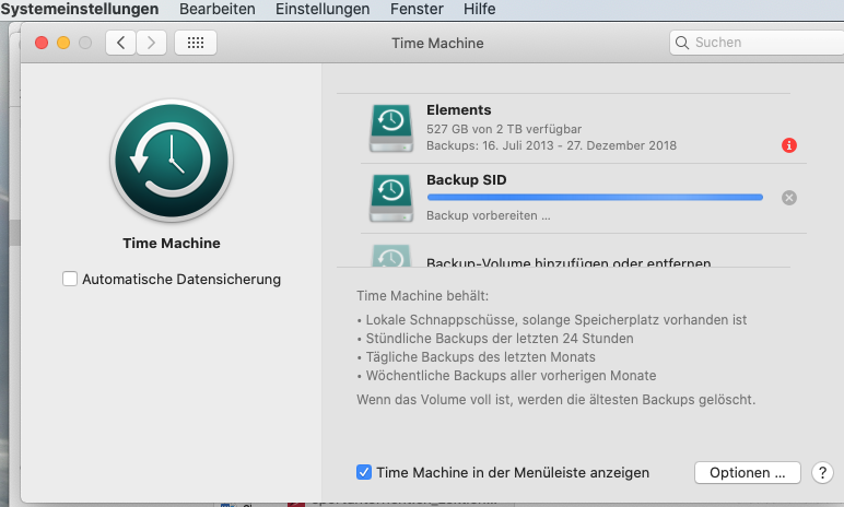 seit Catalina geht das Backup nicht mehr. Das Volume wird zwar erkannt, aber der Prozess kommt nicht weiter als "Backup vorbereiten..." Die Schrift ist in grau, nicht schwarz wie normalerweise, wenn eine Funktion verfügbar ist.
