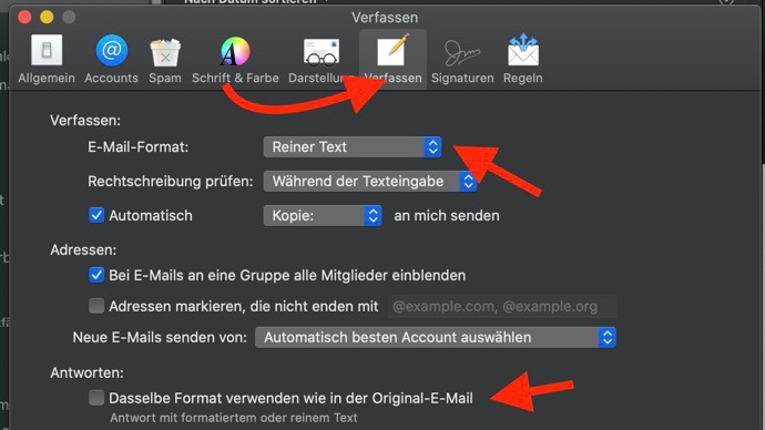 - Überprüfe doch mal Deine Einstellungen für "Mail > Verfassen". Ich habe dort "Email Format > Reiner Text" ausgewählt, weil ich es selbst nicht mag, wenn mir jemand formatierten Text schickt und ich dann viel Arbeit habe, die Schriftgrösse und den Stil so zu ändern, dass ich es lesen kann. Wenn "Reiner Text" eingestellt ist, wird beim Verfassen einer neuen Mail die Formatierungsleiste nicht unbedingt eingeblendet.