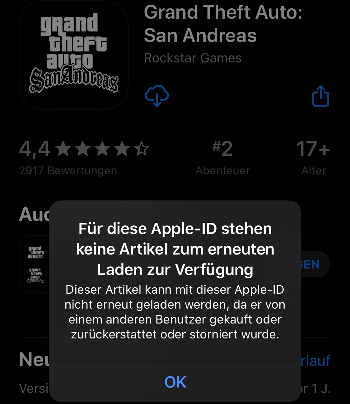 Ich wollte eben ,,GTA San Andreas“ herunterladen und mir wurde die Meldung ,,Dieser Artikel kann nicht erneut geladen werden, da er mit einer anderen Apple ID geladen wurde“ angezeigt die Apple ID gibt es aber nicht mehr und ich würde trotzdem gerne das Spiel erneut kaufen.