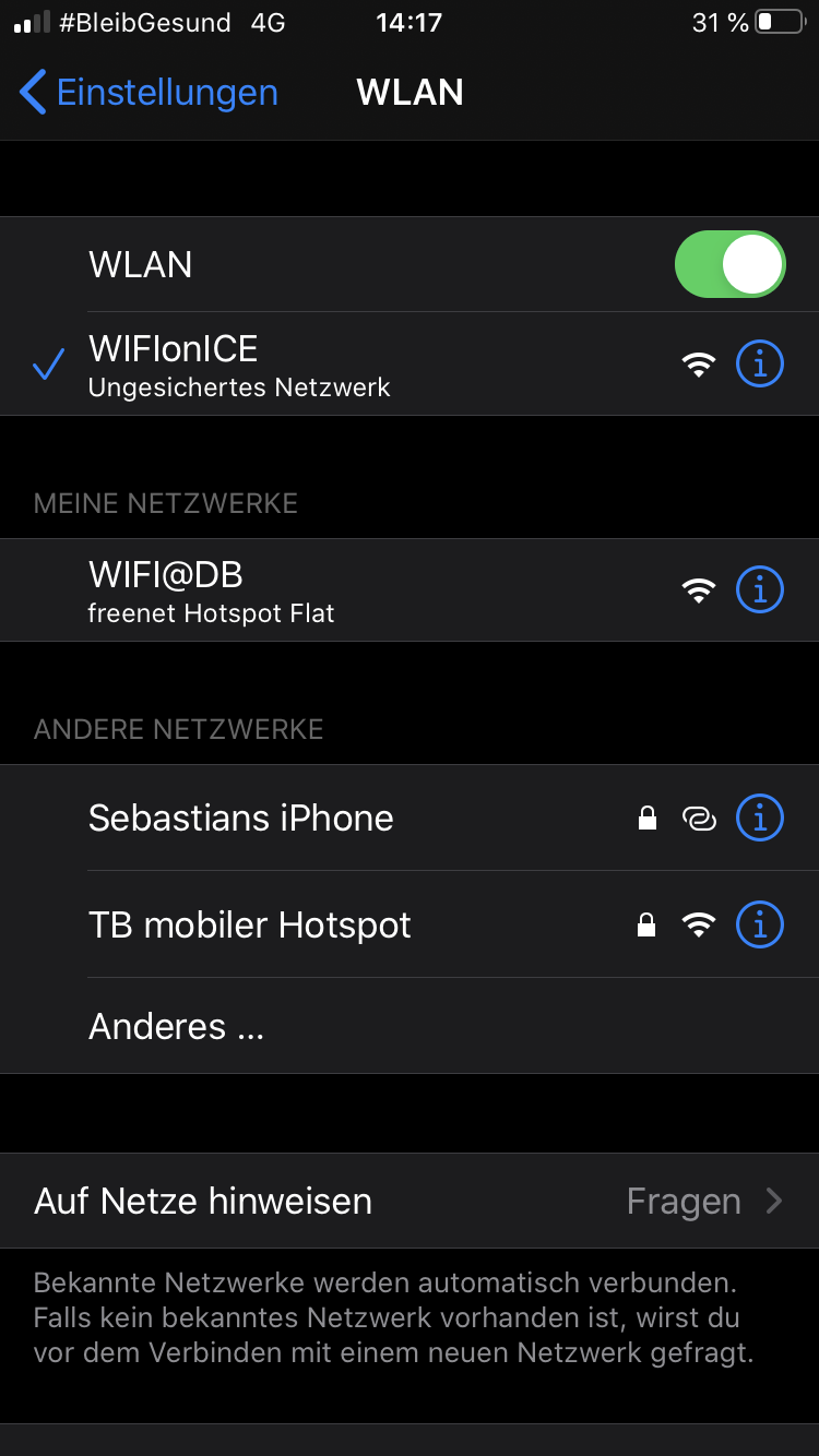 Sitze gerade in einem ICE und versuche vergeblich mich den wlan zu verbinden! Das Häckchen ist zwar da, aber ich komme nicht in das wlan! Dasselbe war im Krankenhaus...was kann das sein?
