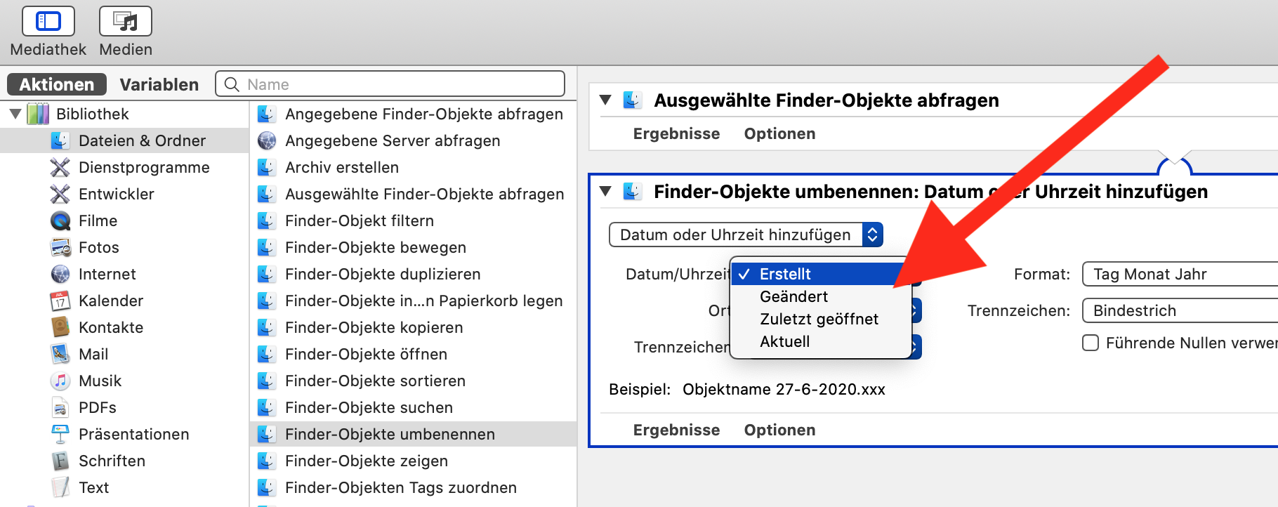 für den Dateinamen verwenden, da es das tatsächliche Aufnahmedatum ist. Ich verwende dafür meistens den Automator, dort wird mir aber nur „erstellt“ oder „geändert“ angeboten, was meistens ausreicht.