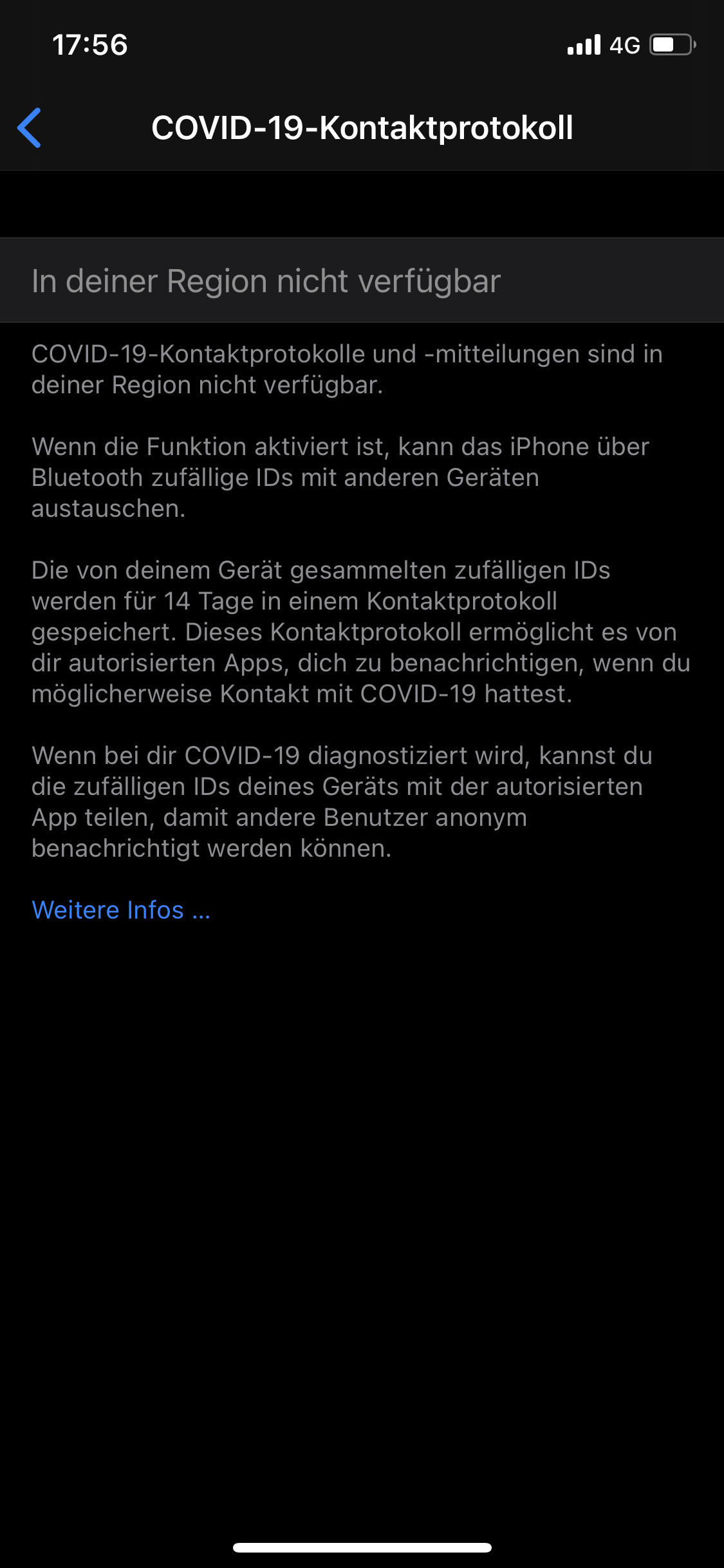 Ich verwende seit ende letzter Woche die Beta von IOS 14. Nun musste ich feststellen dass sich das COVID Tracking in den Einstellungen unter Datenschutz > Bluetooth > COVID-19-Kontaktprotokoll nichtmehr aktivieren lässt mit der Nachricht „in deiner Region nicht verfügbar“. Auf der älteren Version 13.x hat das Problemlos funktioniert. Ich wohne in der Schweiz und konnte diese Funktion zuvor problemlos nutzen. Gibt es irgendwelche Informationen diesbezüglich? Wird diese Funktion in naher Zukunft wieder freigeschaltet?