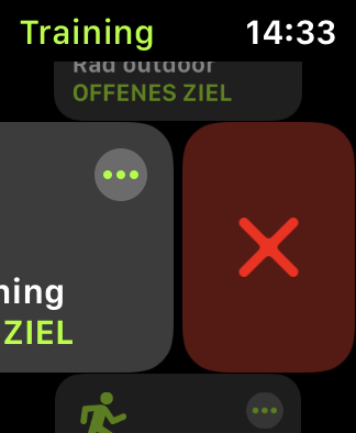 Die Trainigsapps starten und bei der entsprechenden Trainingsart nach links wischen, dann auf das rote Kreuz tippen.