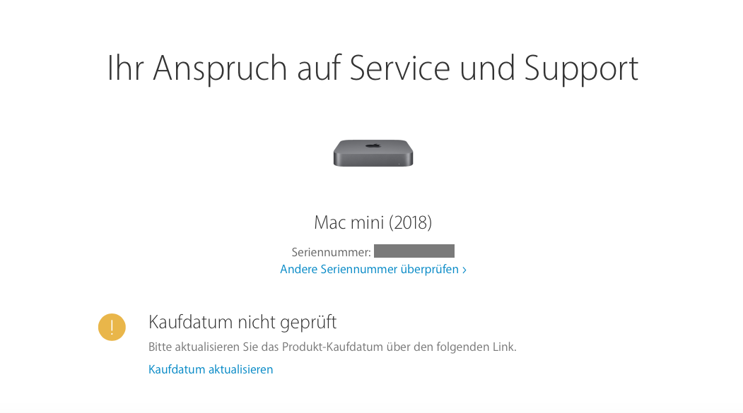 kannst du über den Apple Anspruch auf Service und Support prüfen – Apple Support selbst checken. Der Mac Mini ist von 2018.