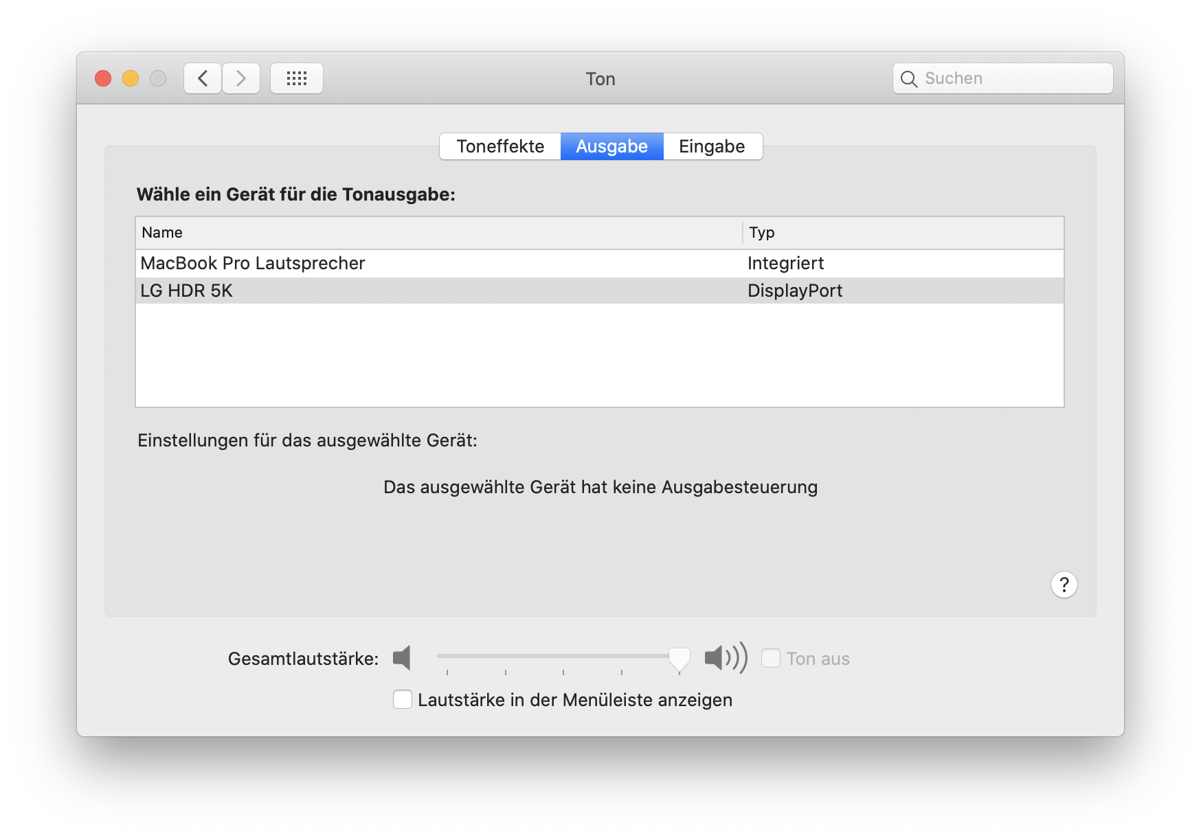 - Unter MacOS 10.15 sehe ich unter Systemeinstellungen ==> Ton nur „... das Gerät hat keine Ausgabesteuerung“ (Siehe Screenshot)