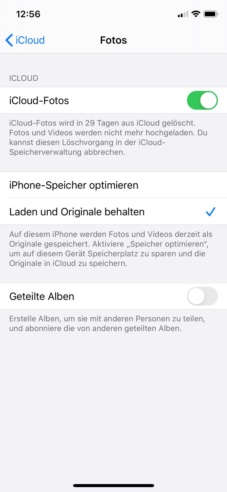 Bei Einstellungen ist "Fotos" auf "ein" und es steht dass ich bei der Speicherverwaltung das abbrechen kann. Allerdings wird bei der Speicherverwaltung am Handy nichts angezeigt.