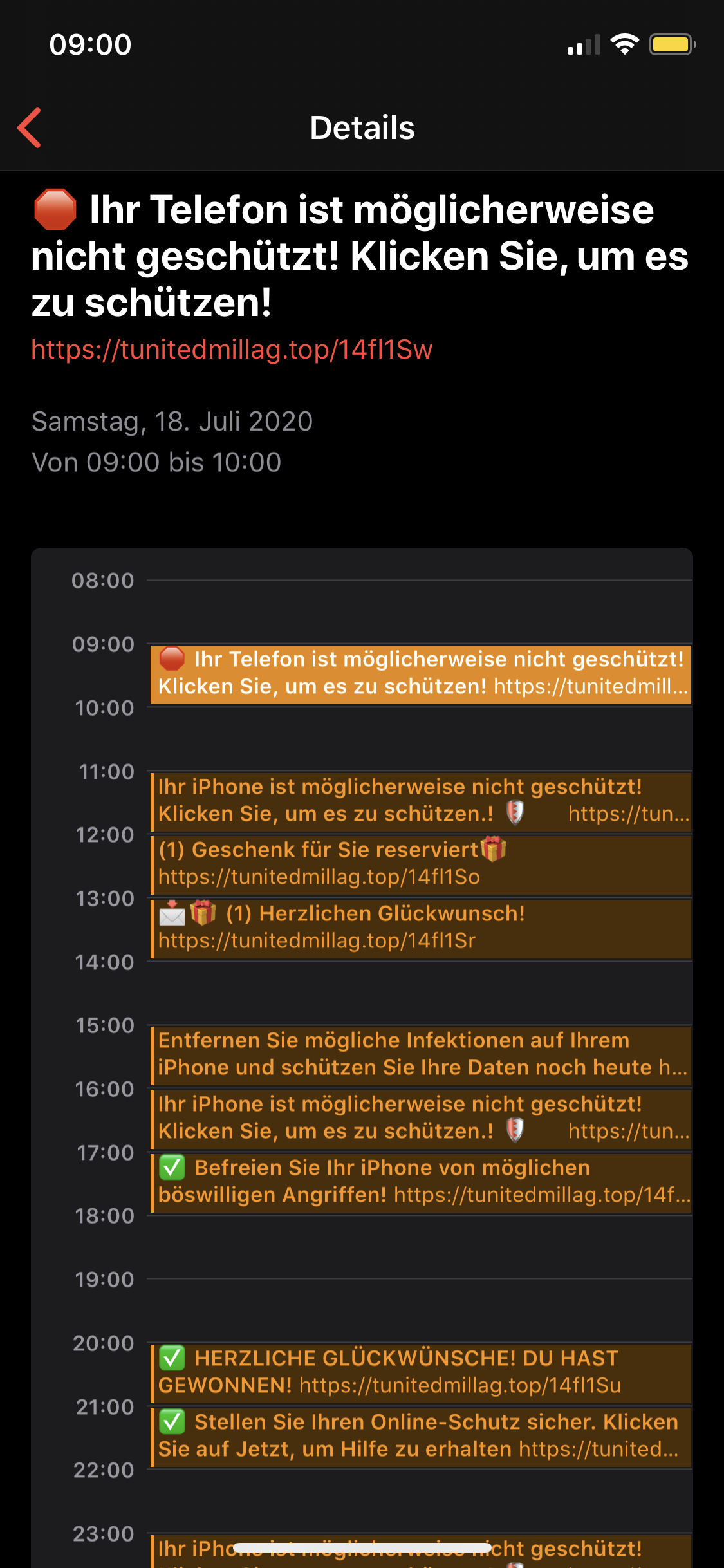 ich habe seit gestern einen Kalendereintrag den ich nicht selbst gemacht habe und den ich auch nicht löschen kann. Er warnt mich vor Sicherheitslücken auf meinem Handy und hat links hinterlegt. Er erscheint auch immer nur am aktuellen Tag. Heute ust er wieder da gestern ist nichts mehr drin.