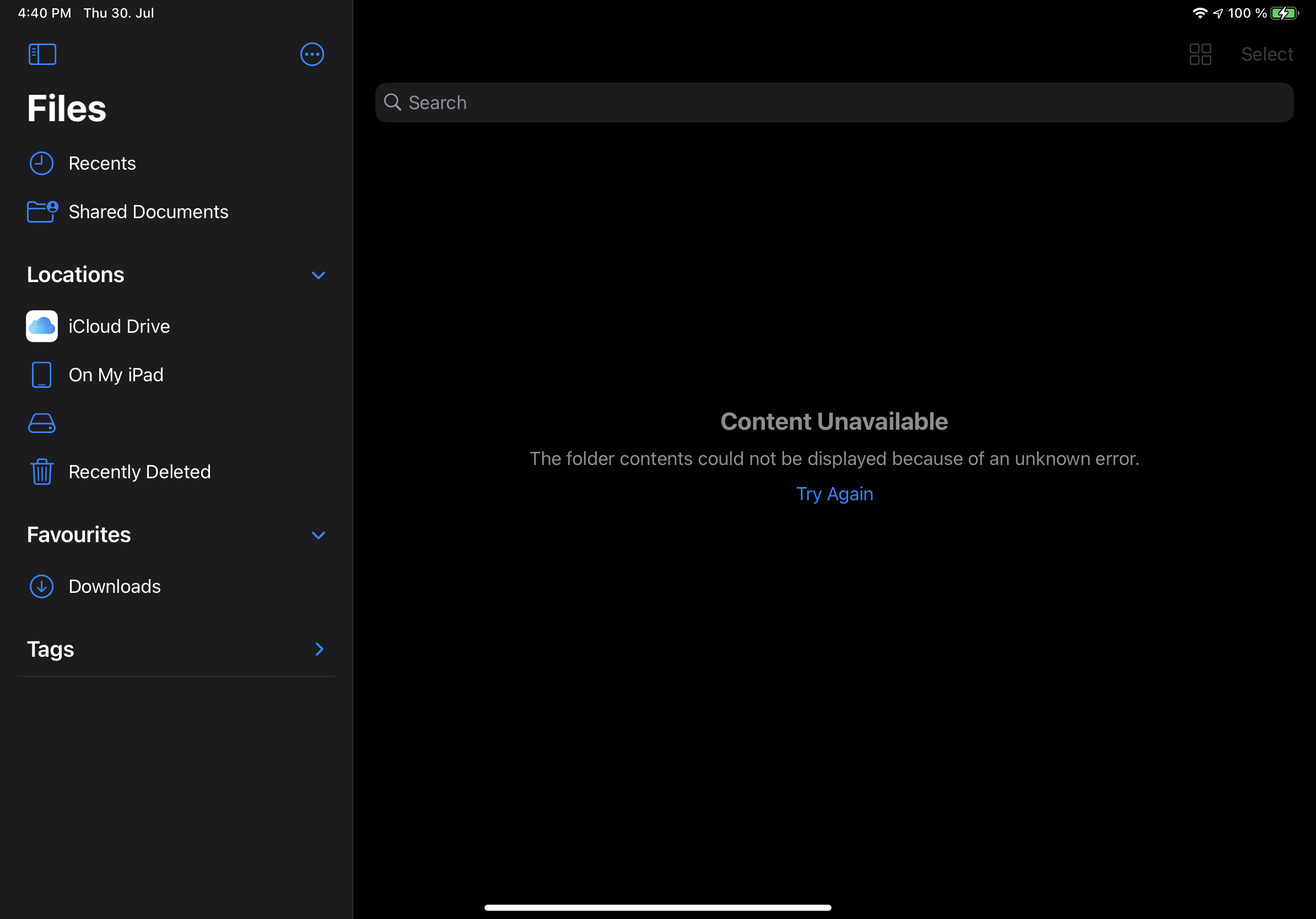 Ein Neustart vom iPad, sowie eine Neuinstallation der Files App helfen nicht.