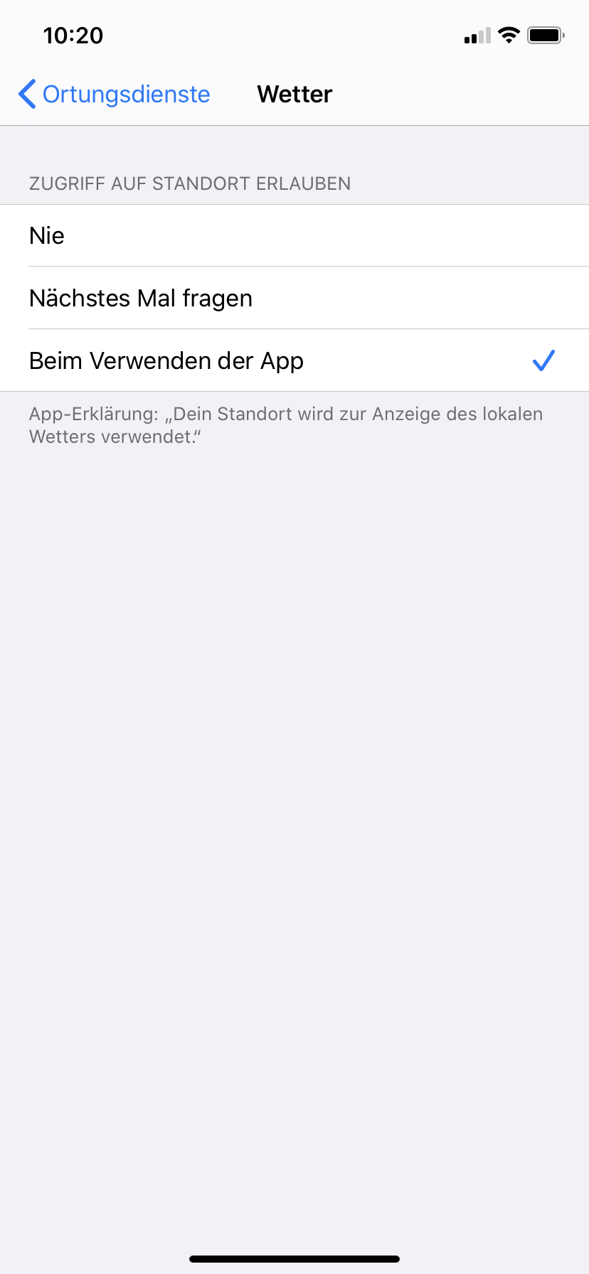 In dem Fall ist die Einstellung "Beim Verwenden der App" korrekt, da immer nach dem Start sofort der Standort bestimmt wird.