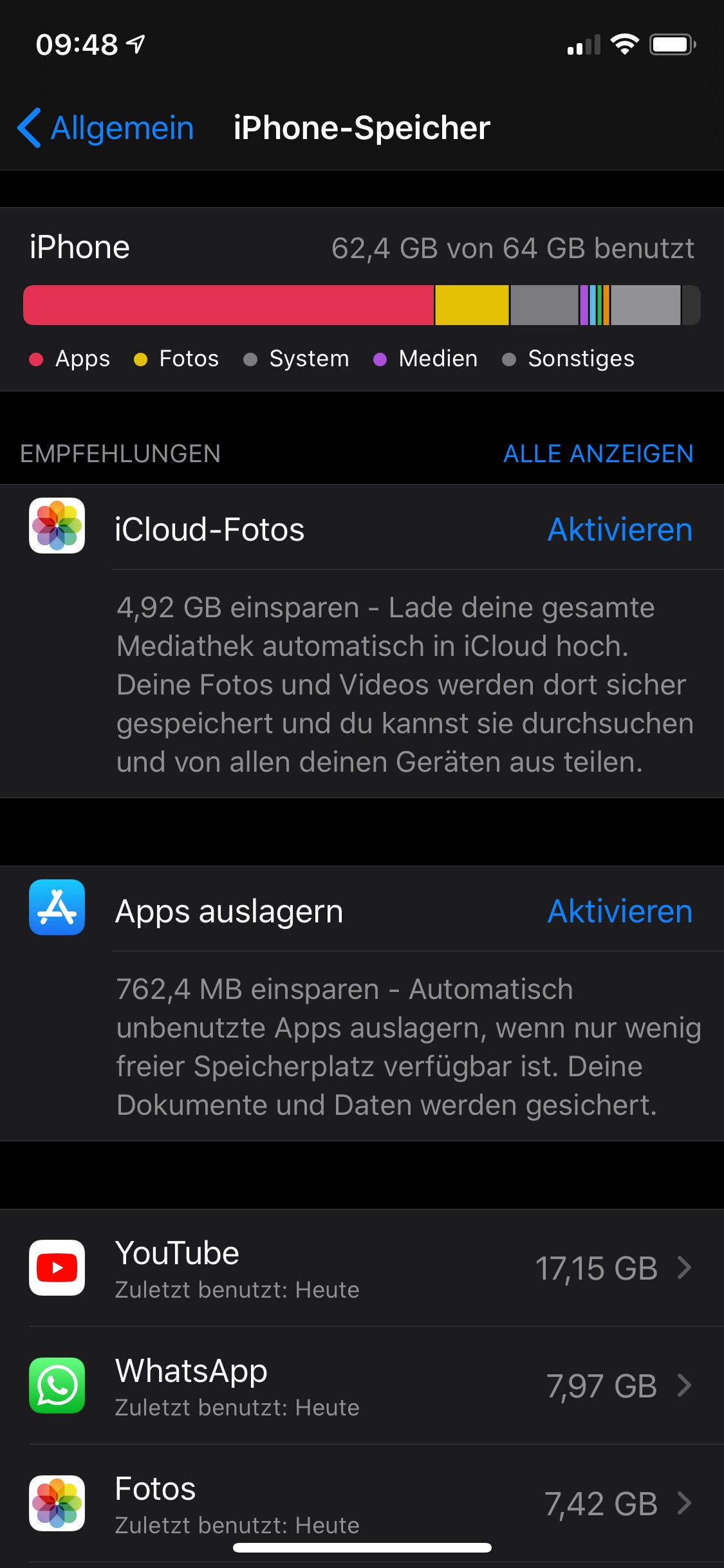 mein iPhone meldet mir heute mal wieder, dass der Speicher fast voll ist. In der "iPhone-Speicher" Übersicht sehe ich, das bspw. die Youtube App 17,15GB belegt.
