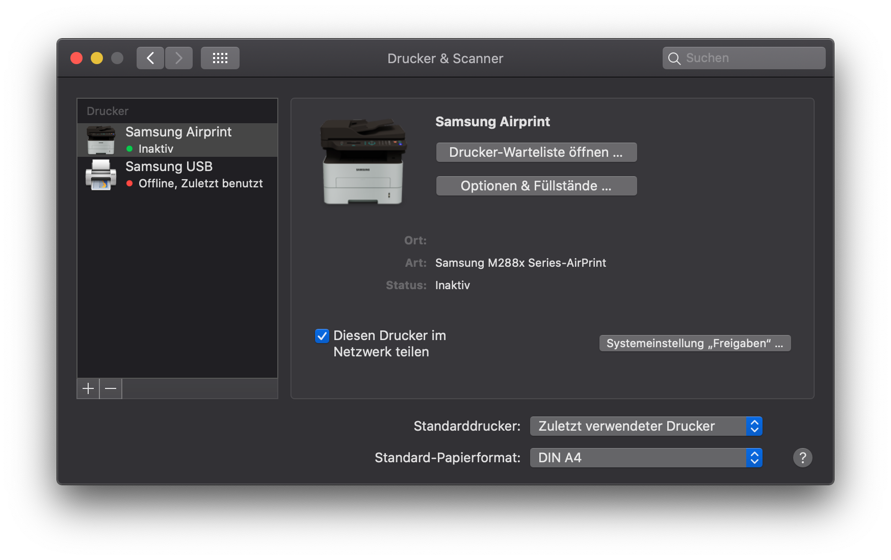 Den Multifunktionsdrucker von Samsung konnte ich als Drucker einbinden, aber nicht als Scanner. Er ist über VueScan ansprechbar, aber nicht über Vorschau/Ablage/Aus Scanner importieren (ist ausgegraut).