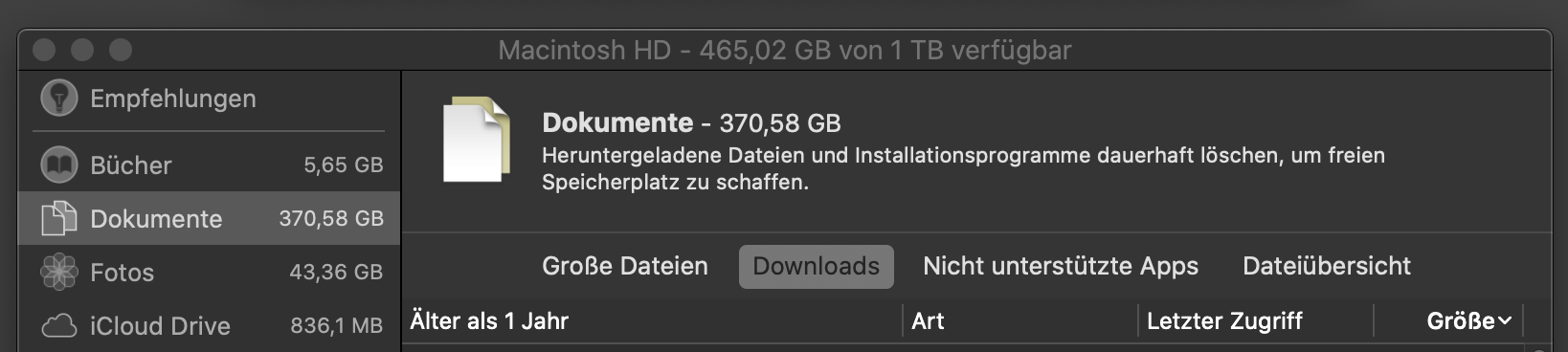 Im nächsten Schritt, kannst du nun in den jeweiligen Gruppierungen (Bücher, Dokumente, Fotos, ...) die weiteren Auswahloptionen mit ihren Tabs (“Große Dateien”, “Downloads”, etc.) auf der rechten Seite sehen, so dass dir das Auswählen der zu löschenden Dateien, insbesondere der großen Dateien, leichter fällt, da diese nicht nur nach der Speichergröße sortiert angezeigt werden, sondern auch nach dem Alter.