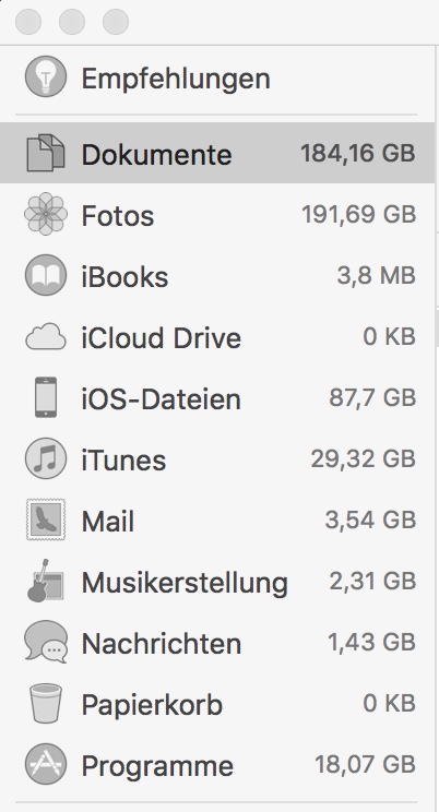 • 185GB "Dokumente" (unter "über diesen Mac"; Inklusive oben genannter Fotos-Mediathek)