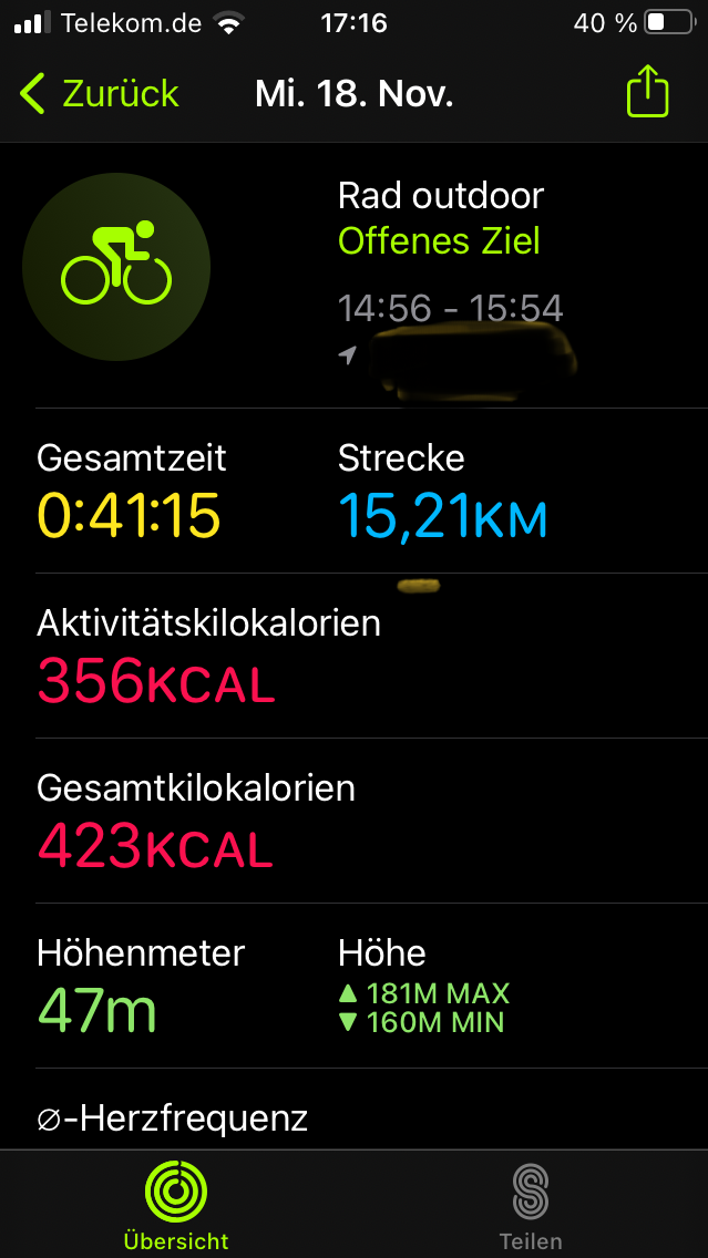 Ich habe aber nach wie vor das Problem, dass etwas nicht passt, also aus der Welt ist das Thema noch nicht. Habe zwischenzeitlich alles komplett platt gemacht, bis auf das iPhone selbst und bin von 0 wieder gestartet. Die ersten Trainings sahen gut aus aber gestern hatte ich es wieder: 47Min Rad gefahren (auch sportlich, also nicht geschoben oder sonstiges) und nur 32Minuten angerechnet bekommen - keine Ahnung, was da los ist.