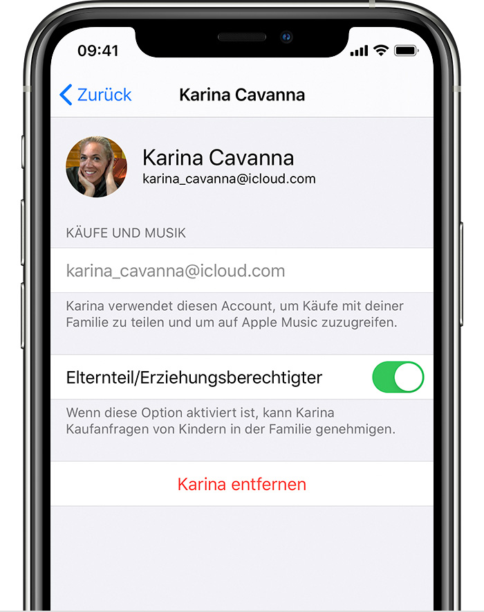 - Tippe auf "Familienfreigabe" und dann auf das entsprechende Familienmitglied.