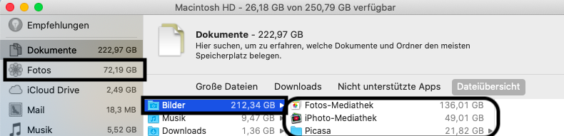 ich sichere gerade alle Fotos in der iCloud - warum heisst es links das insgesamt 72,19 GB Fotos existieren. Wenn man allerdings auf "Dokumente" klickt, dann heisst es, dass 212,34 GB Fotos existieren - davon befinden sich 136,01 GB in der Fotos-Mediathek.
