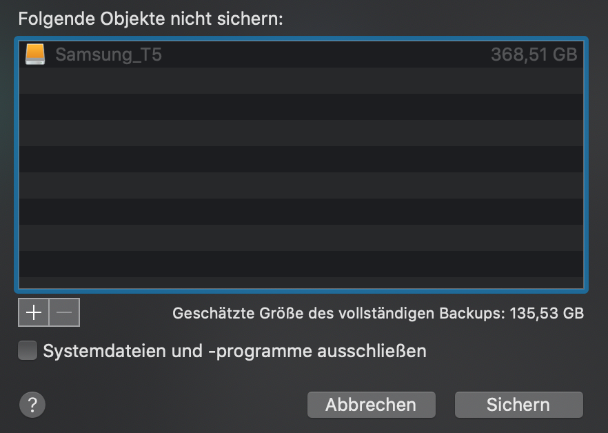 Als Speichererweiterung für den Mac mini habe ich eine 1 TB T5 von Samsung. Die Daten sollen nun im (bisherigen) TM Backup aufgenommen werden. Unter Optionen ist die Festplatte "ausgegraut" und nicht anwählbar bei den Ausschlüssen. Heißt dass, dass die Daten nun ins Backup einbezogen werden?