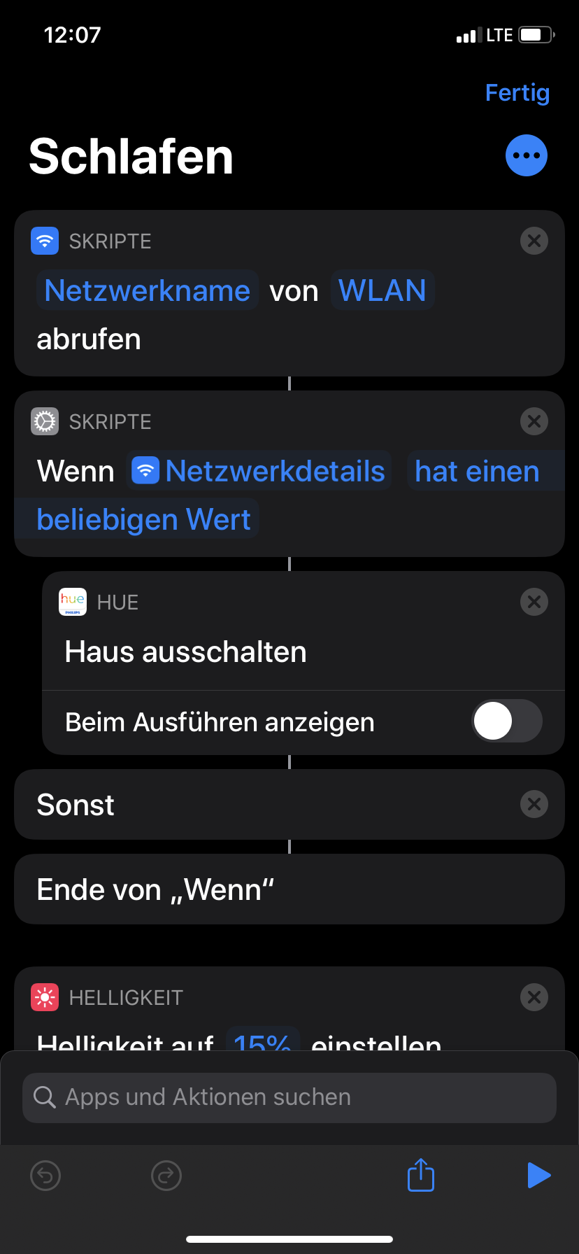 HI ich habe bei mir einen Kurzbefehl „Schlafen“ dieser Schaltet alle meine Hue Lampen und startet den Flugmodus etc.