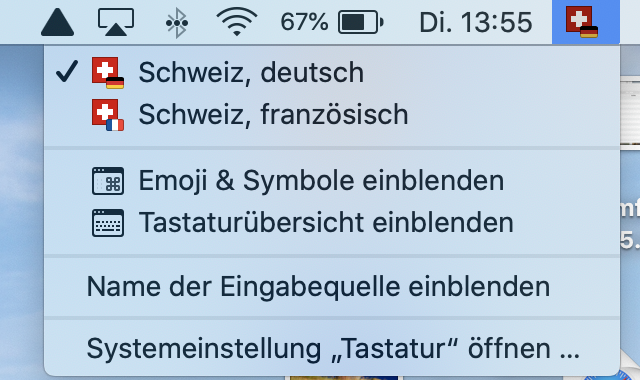 Unter Menü, Sprache ist die Sprache 'Deutsch (Schweiz)' angewählt.
