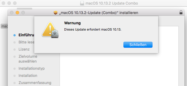 Vielen Dank schon mal für die schnelle Unterstützung. Also, ich habe in der Tat zwei Versionen gestern zum Update geladen. Das eine ist ein direktes update auf 10.13.2 und schreit nach 10.13. Beide habe ich jetzt gelöscht und bin dabeisein Comboupdate auf 10.13.2 downzuloaden. Hoffe es klappt. Ich sag Bescheid, sobald ich das Update geladen habe.