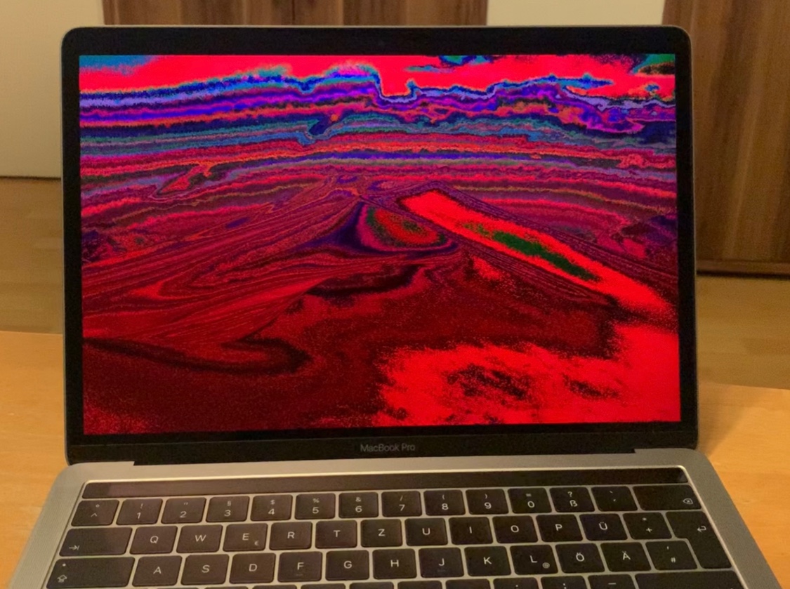 Beim Abschalten des Laptops wird der Desktophintergrund ein paar Sekunden lang angezeigt, dann zeigt das Display schlagartig (Bruchteil einer Sekunde) alle Farben des Farbspektrums und schaltet sich ab.