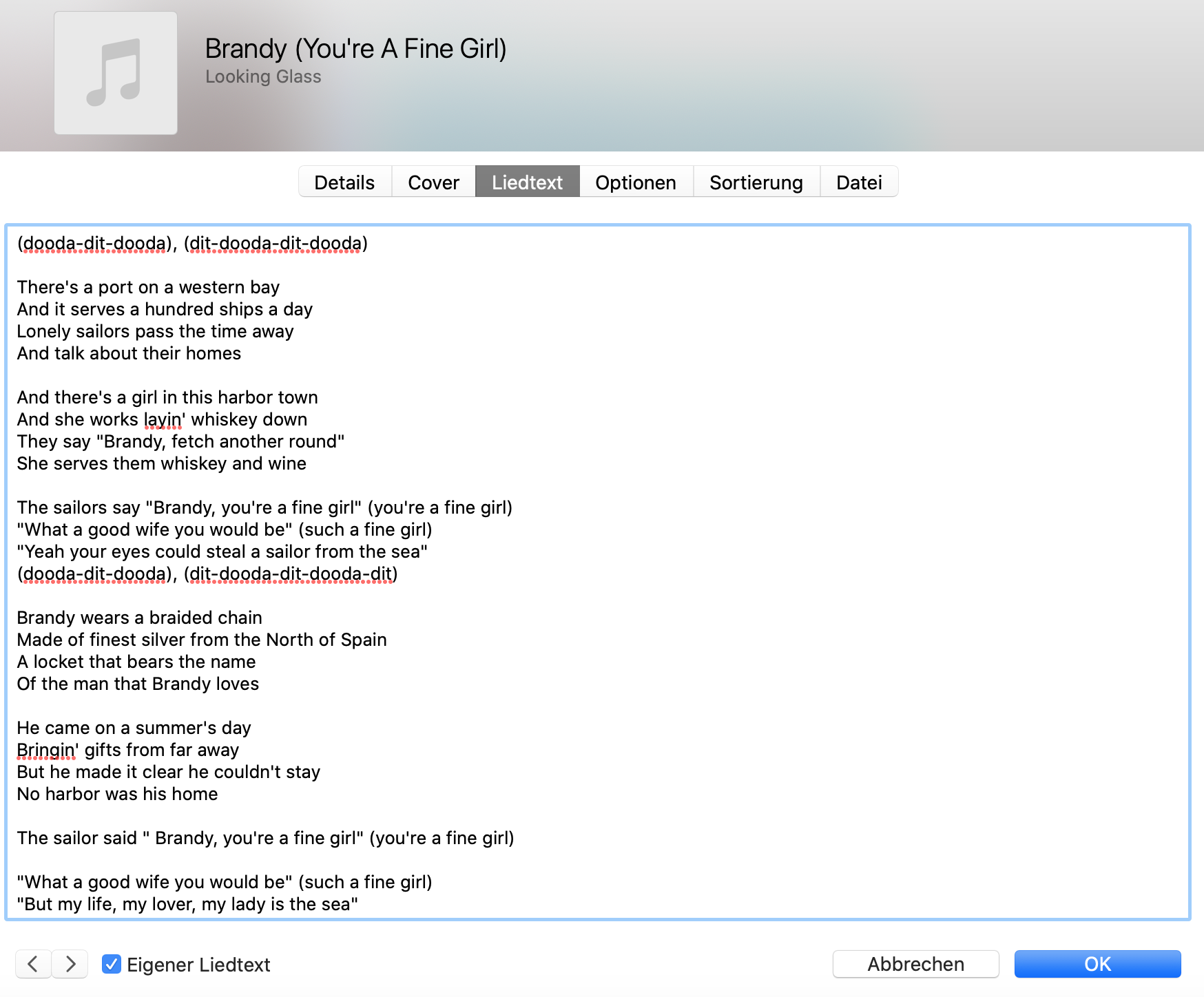 Auch an dich besten Dank für die Infos - ich habe ebenfalls Catalina und wo ich die Texte in iTunes finden/anstellen/sehen kann, weiss ich. Nur, ich möchte ALLE meine "eigener Liedtext", von jedem einzelnen Song, extern abspeichern/exportieren o.ä. Diese Texte müssen doch "irgendwo" im System in einer DB gespeichert sein. Die ganze iTunes APP ist doch eine einzige Datenbank.
