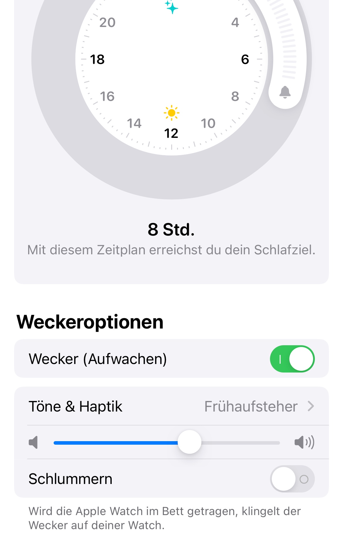 Mit dem neuen Update ist es so, dass es automatisch vorgegeben ist, dass mein Wecker der Schlafenszeit automatisch auf der Watch aktiviert wird, wenn ich diese im Bett trage und die Watch auch nicht im Stummmodus sein darf, um den Wecker akustisch zu hören und nicht nur leicht per Vibration zu spüren..