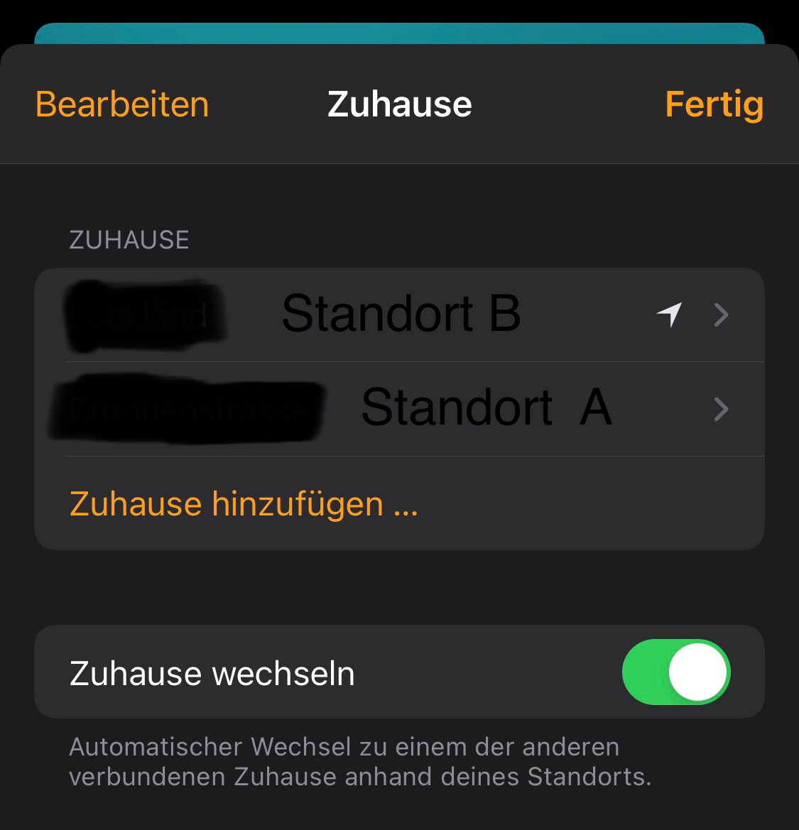 Ich habe zwei „Zuhause“ angelegt und die automatische Erkennung des Standorts aktiviert. Damit soll erkannt werden, wann man in welchem zu Hause ist.