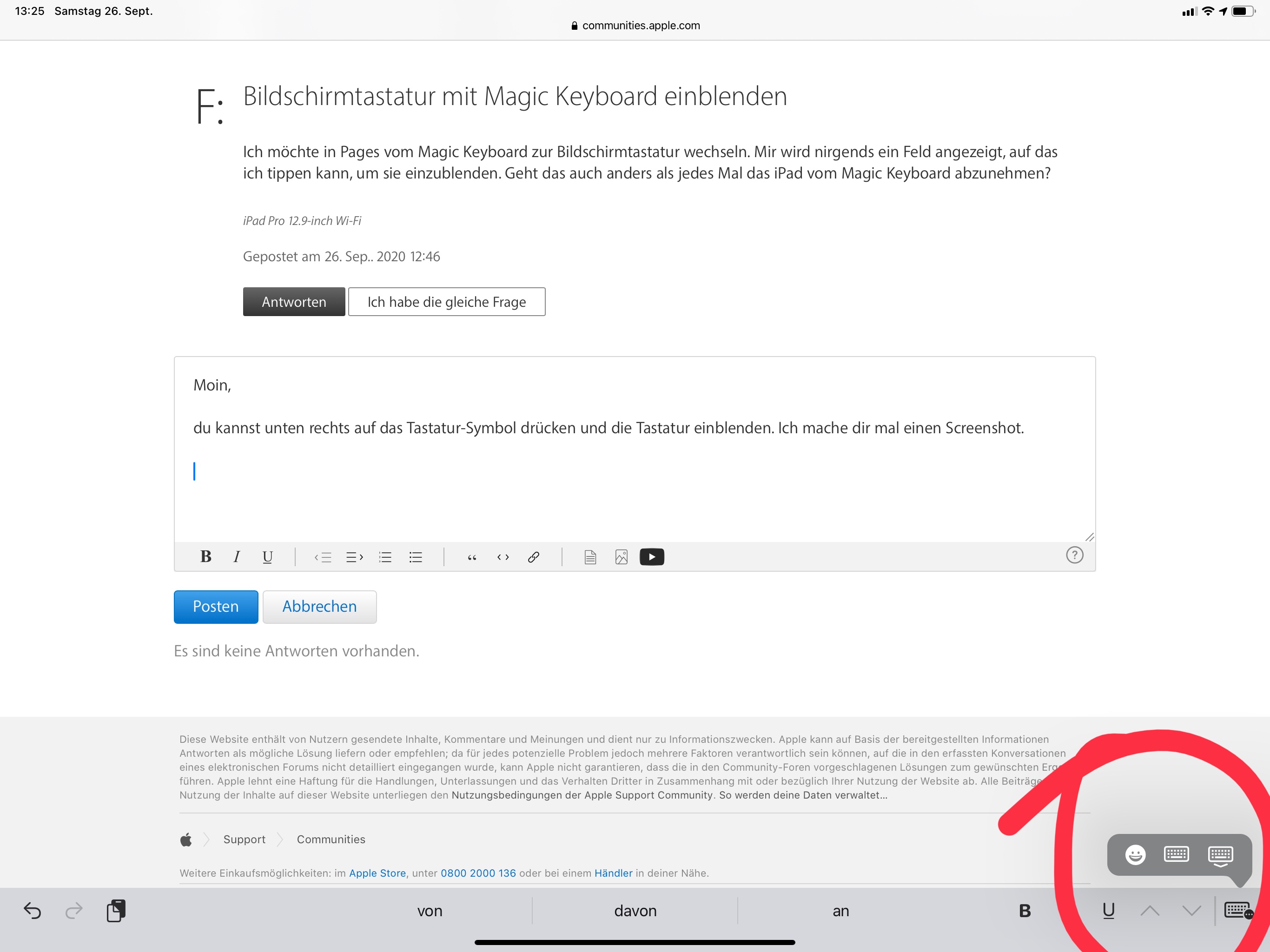 Ich möchte in Pages vom Magic Keyboard zur Bildschirmtastatur wechseln. Mir wird nirgends ein Feld angezeigt, auf das ich tippen kann, um sie einzublenden. Geht das auch anders als jedes Mal das iPad vom Magic Keyboard abzunehmen?
